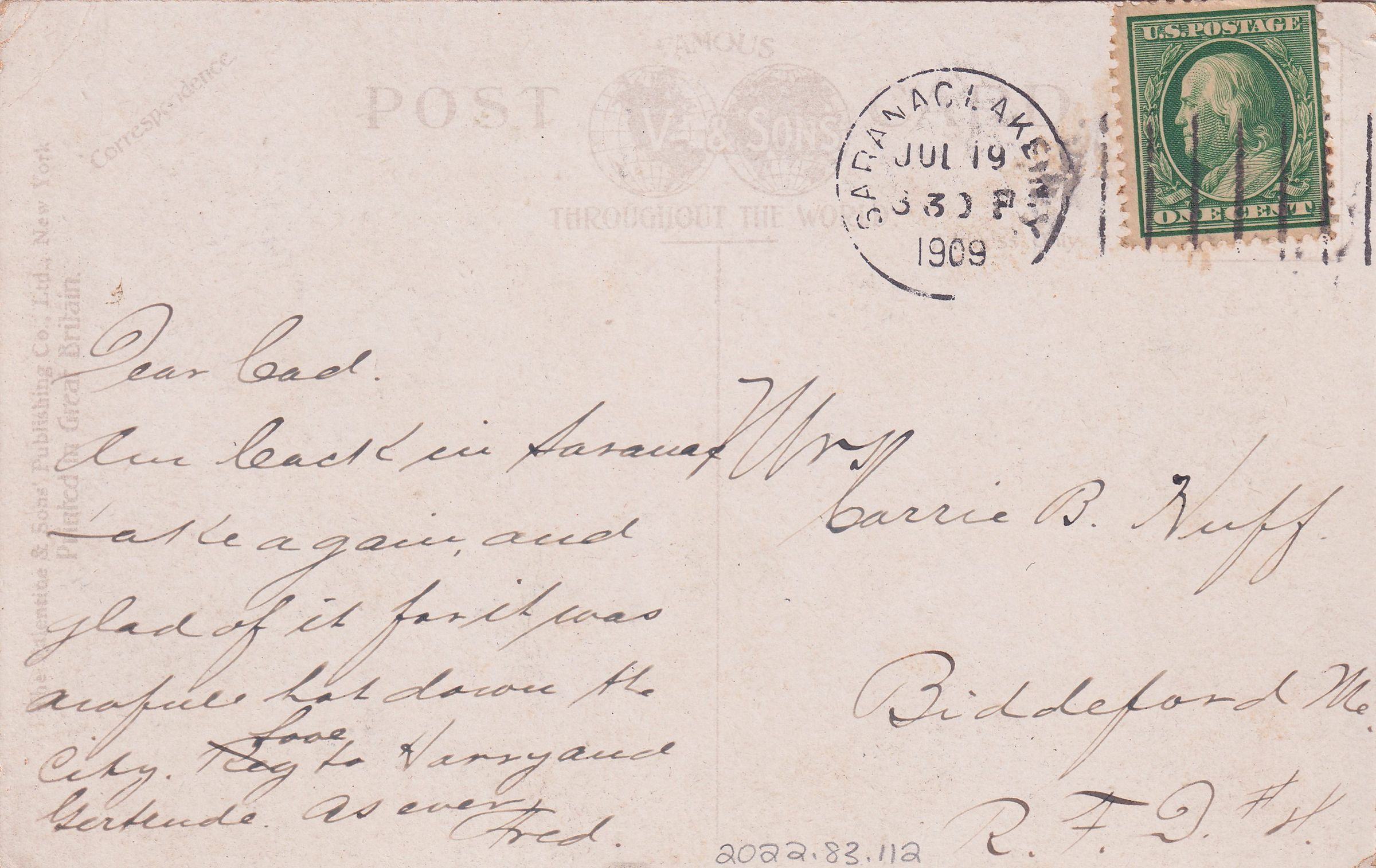 Color postcard showing the view north along Broadway, from the intersection with Main Street. A portion of the Berkeley House is visible at right. Printed caption on front reads, "Looking down Broadway from Main Street. Saranac Lake, N.Y." Printed by the Valentine & Sons' Publishing Co., Ltd., New York. Handwritten message on back reads, "Dear Cad, Am back in Saranac Lake again and glad of it for it was awful hot down the city. Love to Harry and Gertrude. As ever, Fred." Mailed to Mr. Carrie B. Huff, Biddeford, ME, R. F. D. #4.Subject Place
