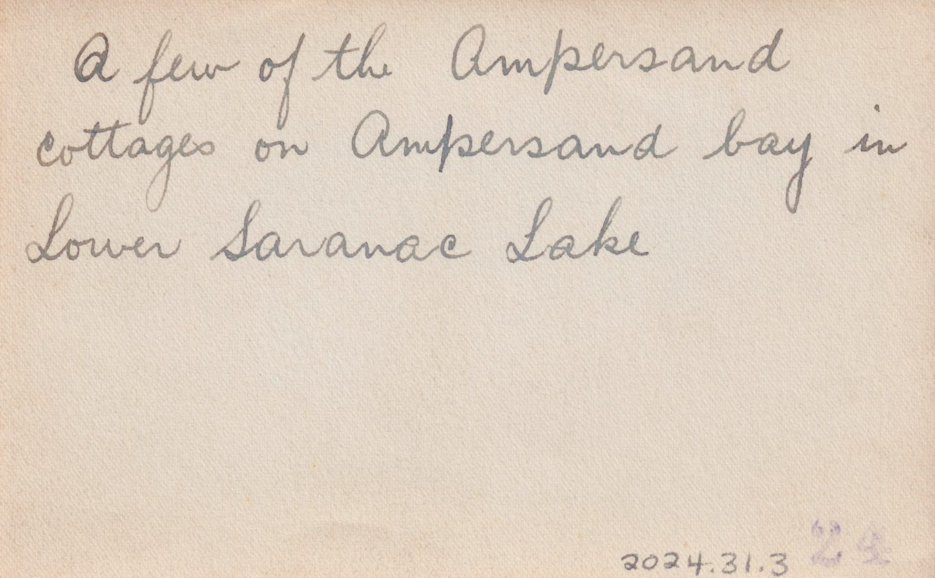 Black-and-White photograph of cabins and houses along the shore of Ampersand Bay in Lower Saranac Lake. Handwritten caption on reverse reads, "A few of the Ampersand Cottages on Ampersand Bay in Lower Saranac Lake."
