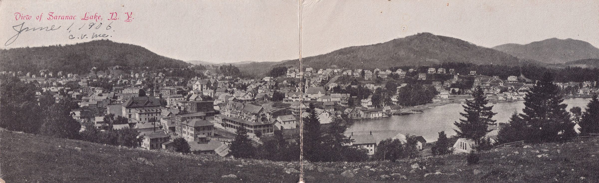 Black and white bi-fold postcard showing a view of Saranac Lake from Blood Hill / Lake Street Hill. The original Harrietstown Town Hall, Riverside Inn, first St. Bernard's Church, first Saranac Lake High School, and many other buildings are visible with Mt. Pisgah and Mt. Baker in the background. Printed caption on front reads, "View of Saranac Lake , N.Y." No printer's mark. Used, undivided back, postmarked Saranac Lake, June 1, 1906. Handwritten note on front reads, "June 1, 1906. C. V. Me." Mailed to Mrs. George W. Wise, East Barre, VT.Subject Place