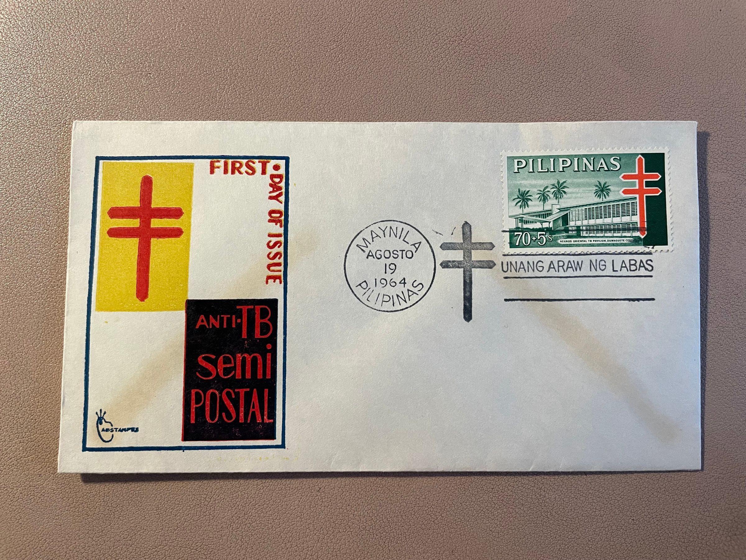 Envelope for first day of issue for stamp featuring Negros Oriental TB Pavilion, Dumaguete City, in the Philippines. Envelope has graphic printed in yellow, red, and black reading, "First day of issue, Anti-TB Semi Postal." Features double-barred cross. Canceled in Manila, August 19, 1964. Envelope has not been used.