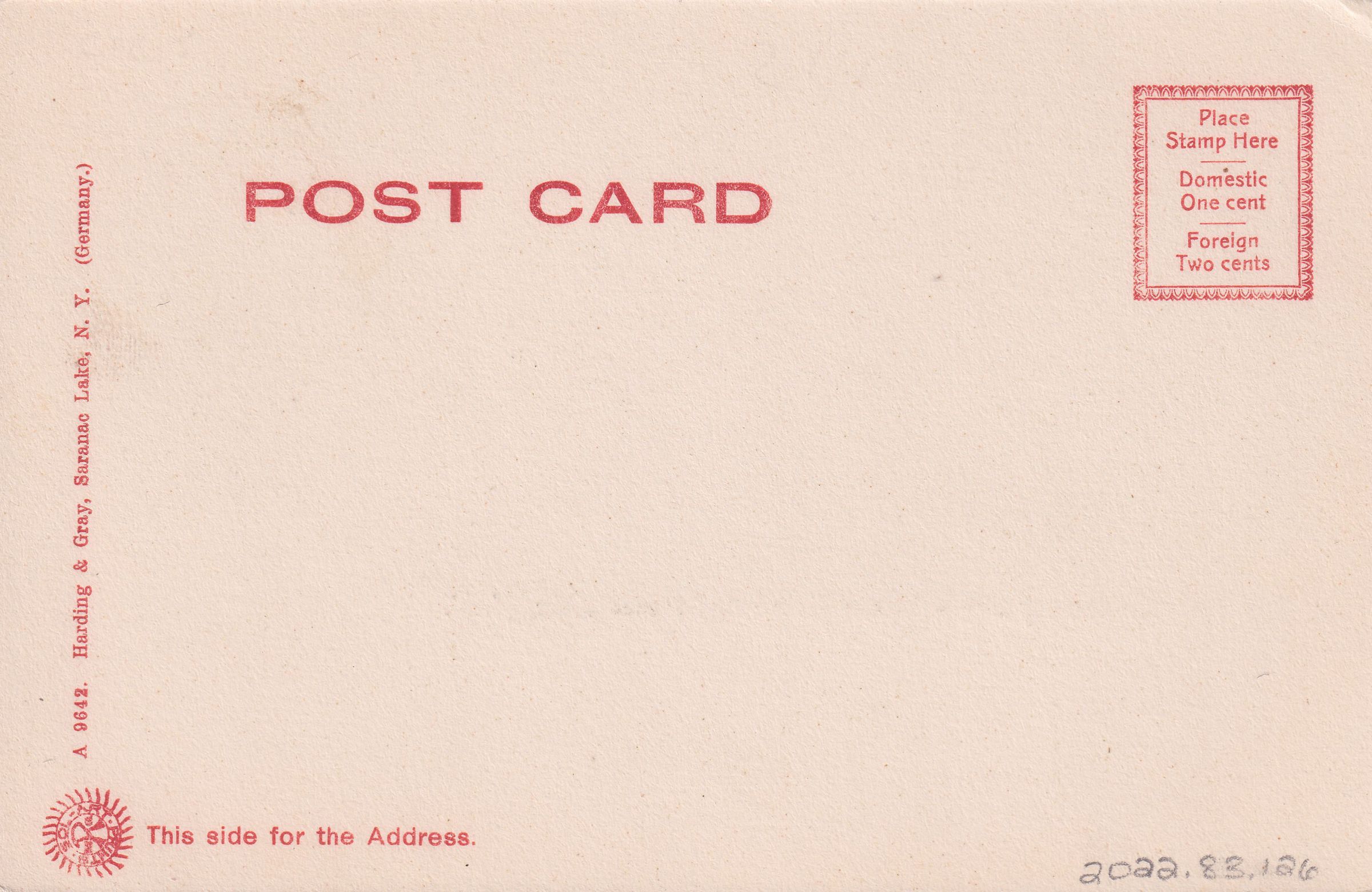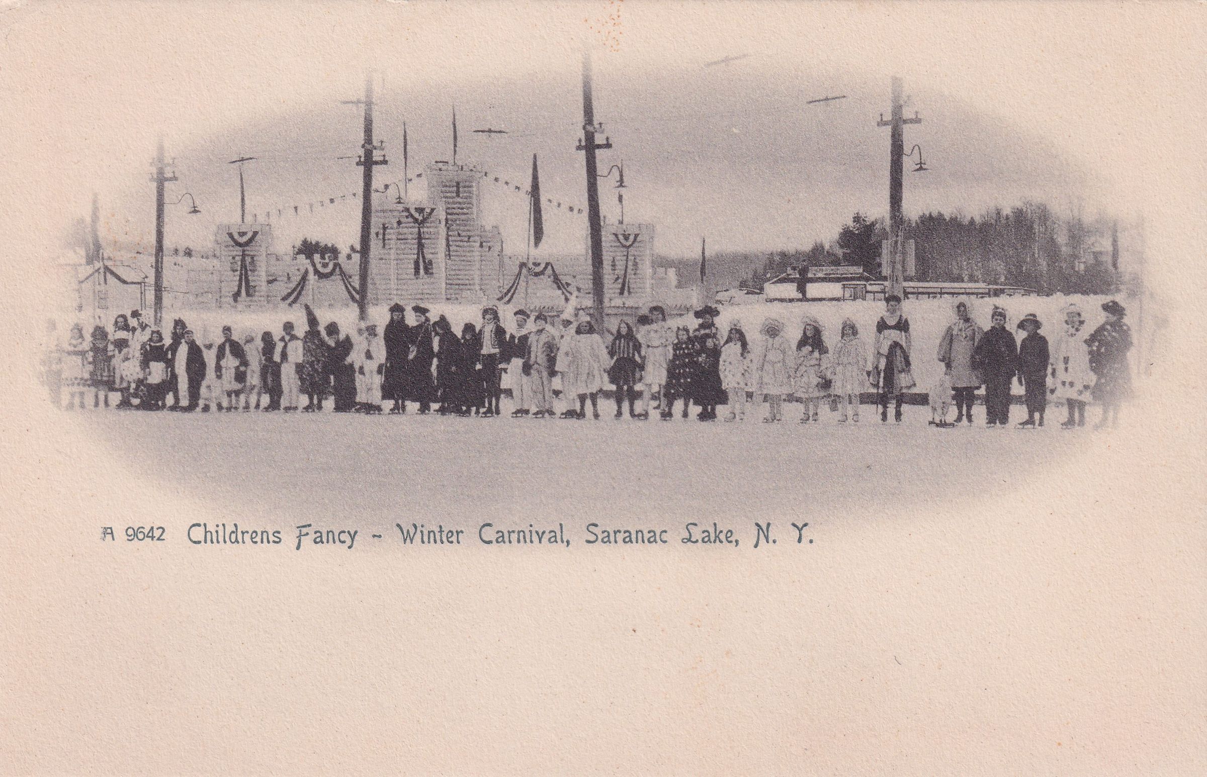 Black and white postcard showing a vignetted view of a line of children wearing costumes and ice skates at Pontiac Bay. The Ice Palace is visible behind them. This is likely from one of the early Winter Carnivals. Printed caption on front reads, "Children's Fancy--Winter Carnival, Saranac Lake, N.Y." Printed by Harding & Gray, Saranac Lake, N.Y. Unused, undivided back, white space on front for message.Subject Place