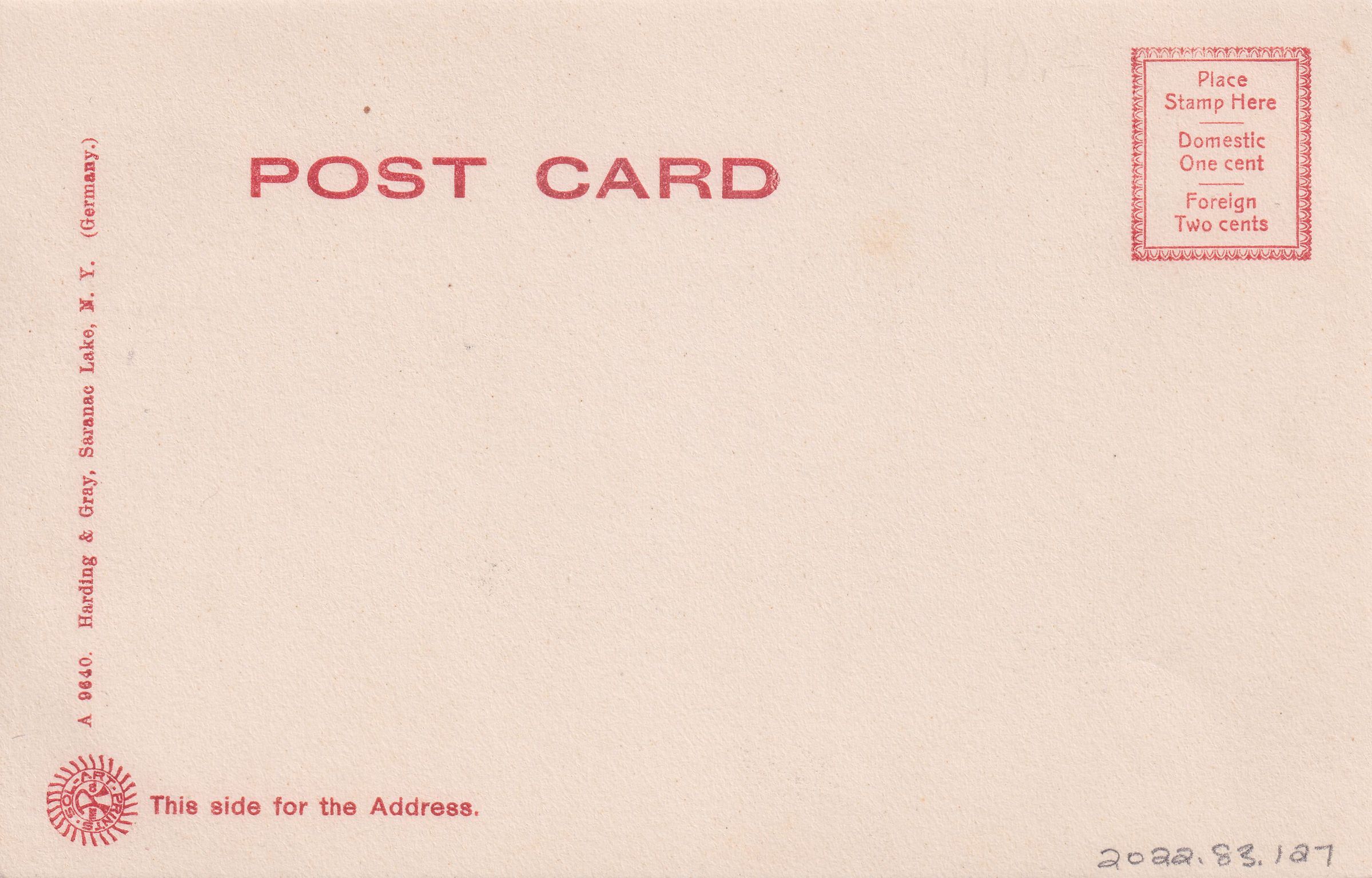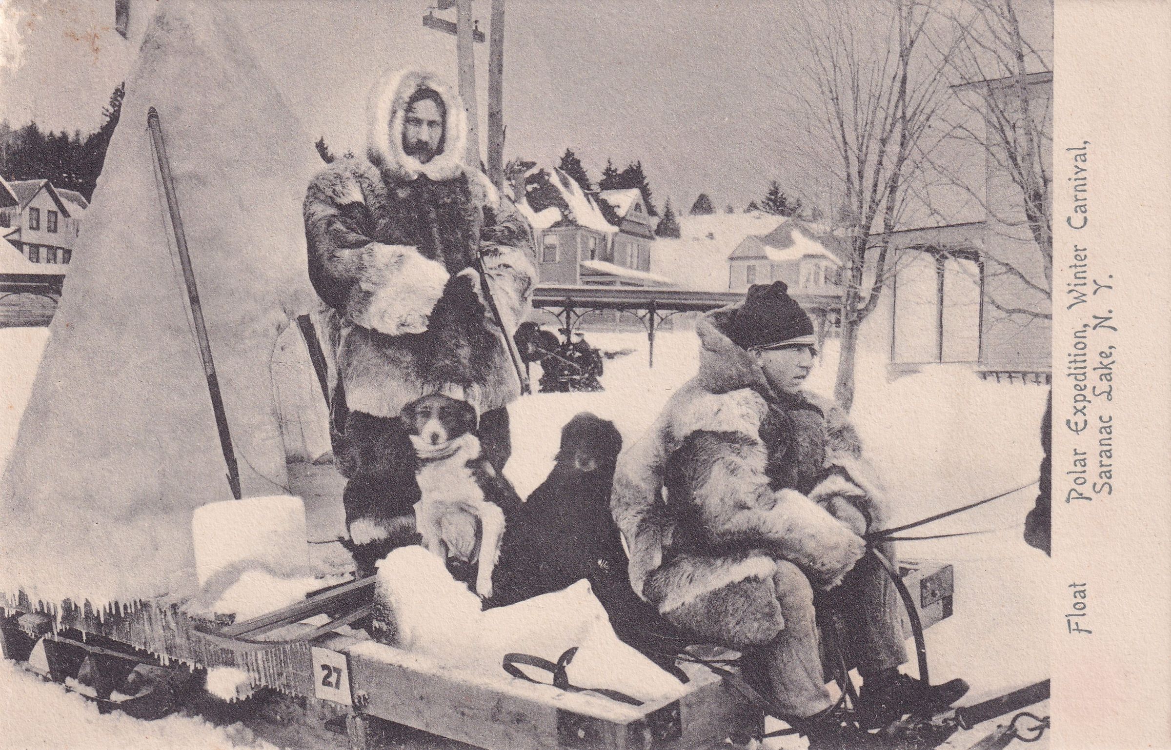 Black and white postcard showing a Winter Carnival float. The float has two men dressed in fur suits with two dogs. There is a tipi-like tent and snow/ice blocks on the float. Likely from an early Winter Carnival parade. Printed caption on front reads, "Float. Polar Expedition, Winter Carnival, Saranac Lake , N.Y." Printed by Harding & Gray, Saranac Lake, N. Y. Unused, undivided back, white space on front for message.Subject Place