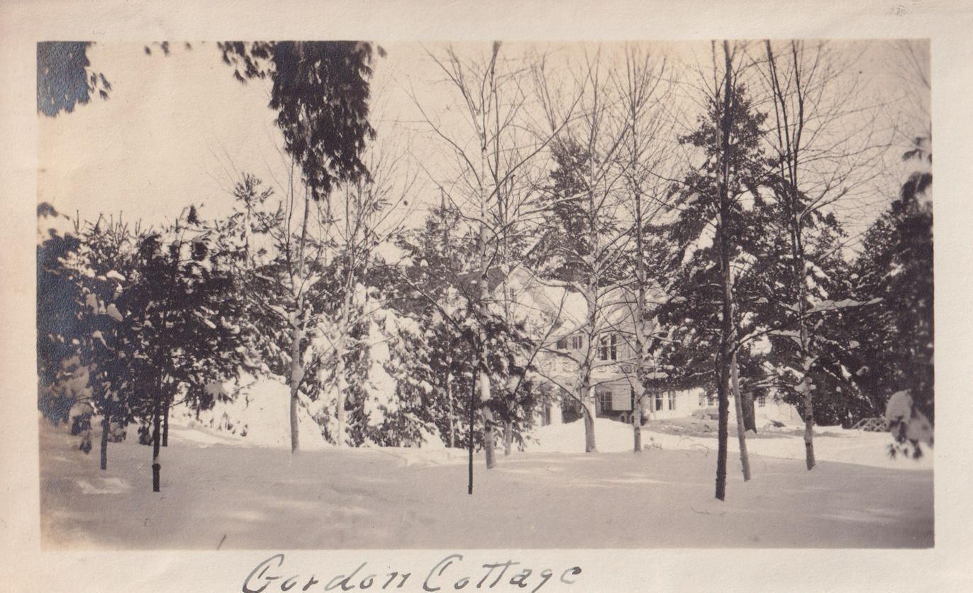 Black-and-white photograph of a cure cottage in the winter, partially obscured by pine trees in the yard. "Gordon Cottage" is written in ink at the bottom of the photograph.
