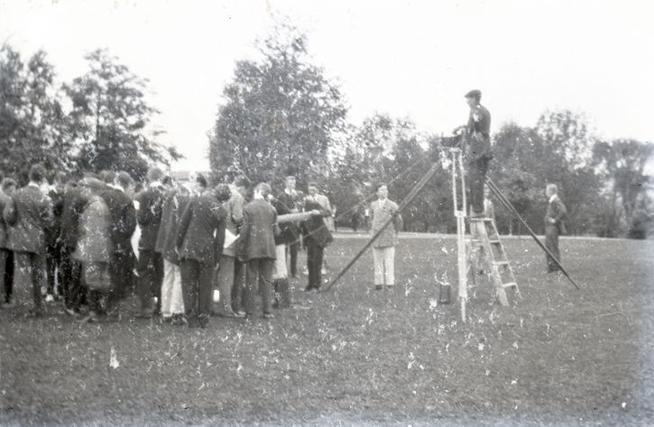 Negative of a group of people standing next to a man standing on a ladder. He is standing before an item, maybe a camera, supported on stilts in a tripod shape. Most likely taken by Mary Ives Baldwin. This item is not fully cataloged but has been uploaded so the image is publicly available; if you would like us to prioritize cataloging this item, please contact the HSL Collections team.