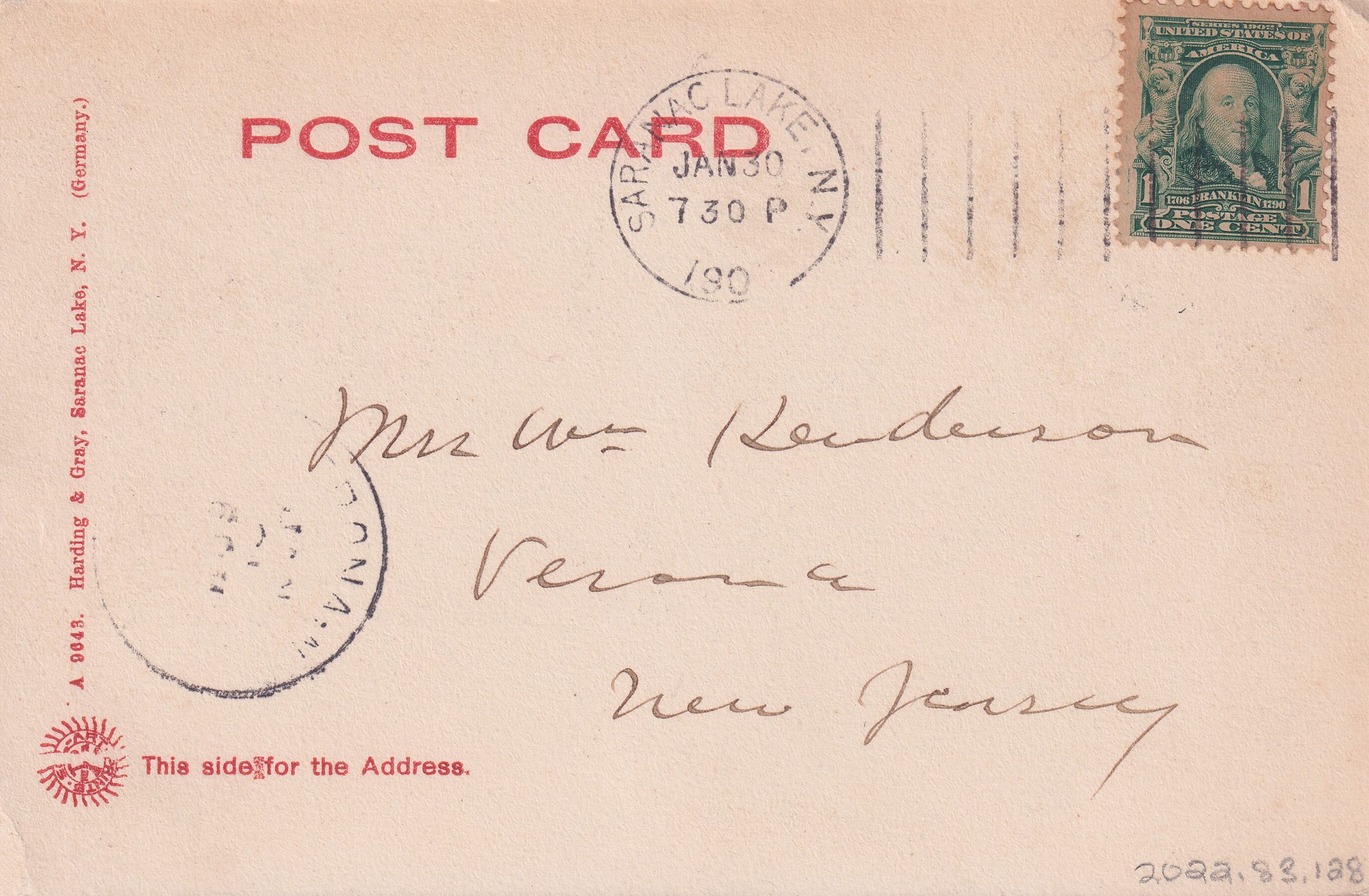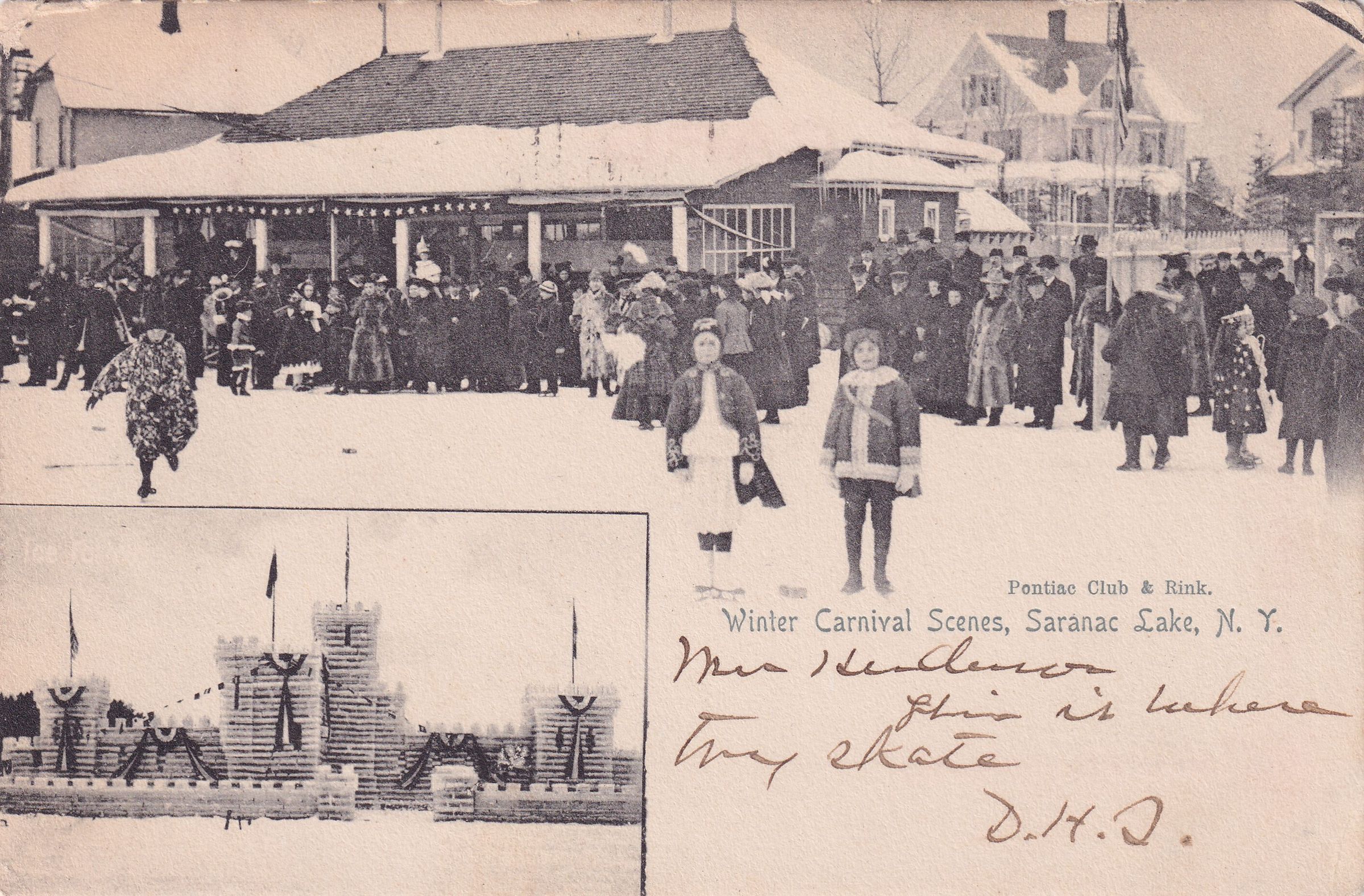 Black and white postcard with two Winter Carnival views. The primary view shows children in fancy dress at Pontiac Bay with crowds of specators behind them. The original Pontiac Club building is visible behind the crowd. An inset image in the bottom left corner shows the Ice Palace. Printed message on front reads, "Pontiac Club & Rink. Winter Carnival Scenes, Saranac Lake, N. Y." Printed by Harding & Gray, Saranac Lake, N. Y. Used, undivided back, white space on front for message, postmarked Saranac Lake, January 30, 190[?]. Handwritten message on front reads, "Mrs. Henderson, this is where they skate. D. H. S." Mailed to Mrs. Wm Henderson, Verona, New Jersey.Subject Place