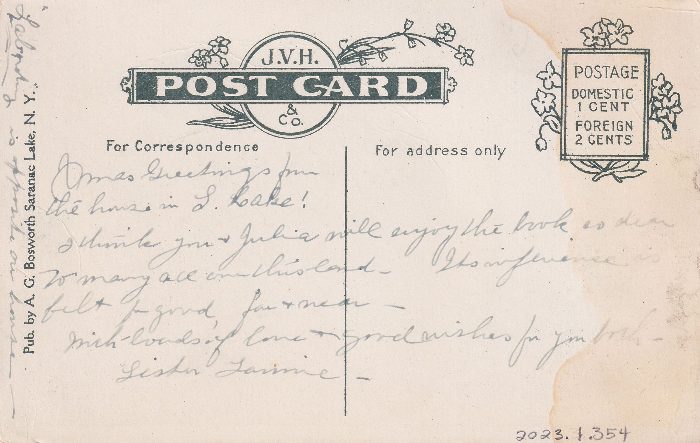 Handwritten message on back reads, "Xmas Greetings from the house in S. Lake! I think you and Julia will enjoy the book so dear to many all on this land. Its significance is felt for good, far & near. With loads of love & good wishes for you both.- Sister Jamie. 'Laboratory' is opposite our house-." No mailing address.Subject Place