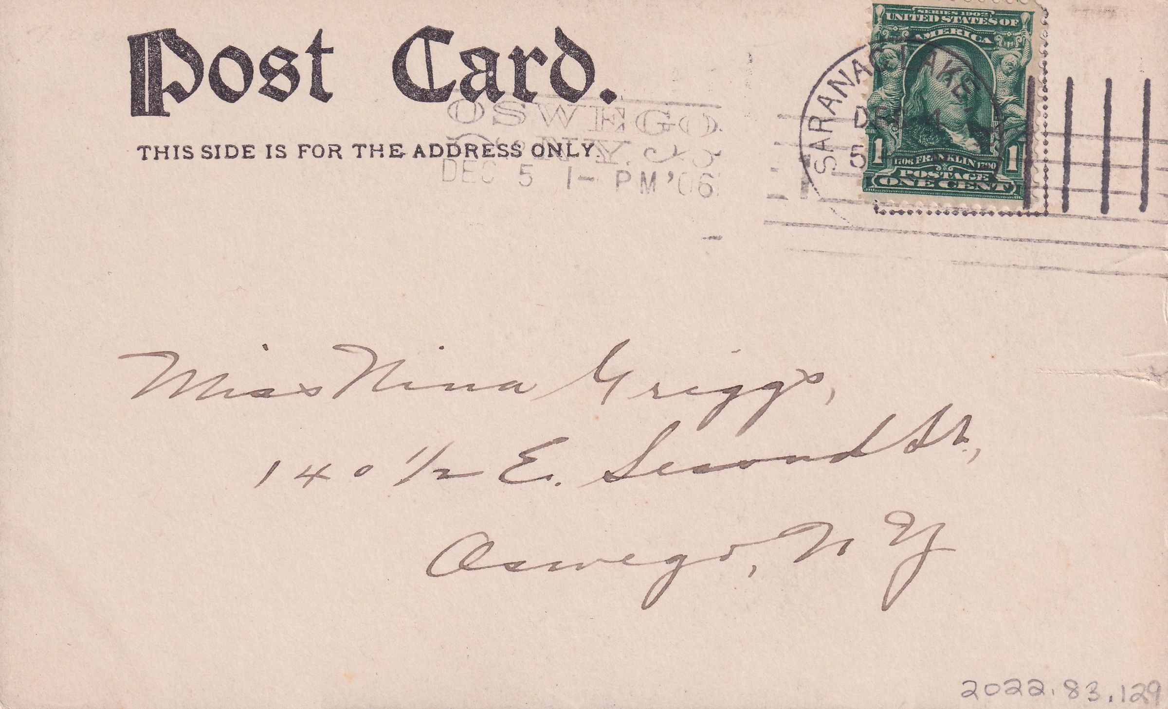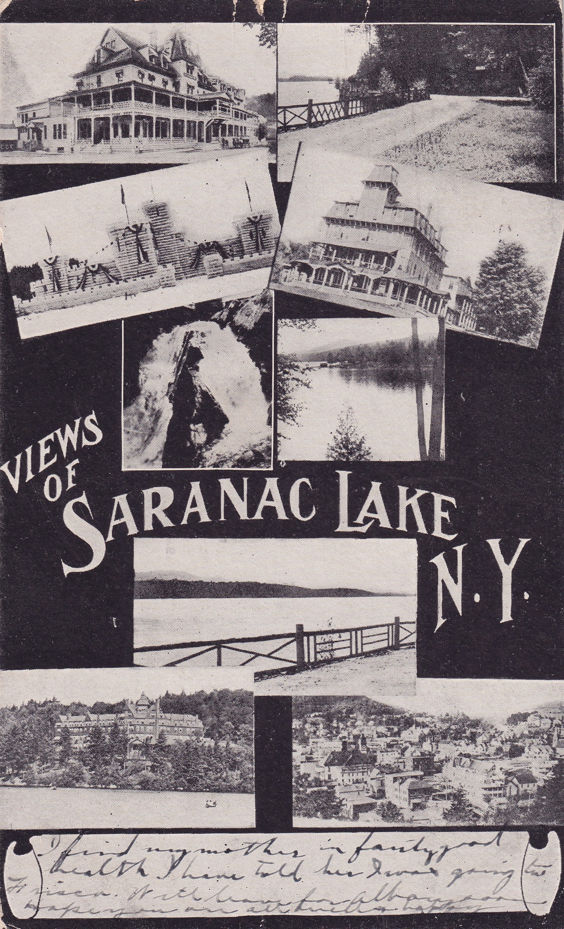 Black and white postcard showing nine scenes of Saranac Lake. Views include the Riverside Inn, Ice Palace, Hotel Algonquin, Ampersand Hotel, and the view from Blood Hill/Lake Street Hill. Also includes several nature scenes. Printed caption on front reads, "Views of Saranac Lake N. Y." No printer's mark. Used, undivided back, white box on front for message, postmarked Saranac Lake, December 5, 1906. Handwritten message on front reads, "I find my mother in fairly good health. I have told her I was going to Frisco.Will leave for Albany soon. Hope you are all well + happy." Mailed to Miss Nina Griggs, 140 1/2 E. Second St., Oswego, N.Y.Subject Place