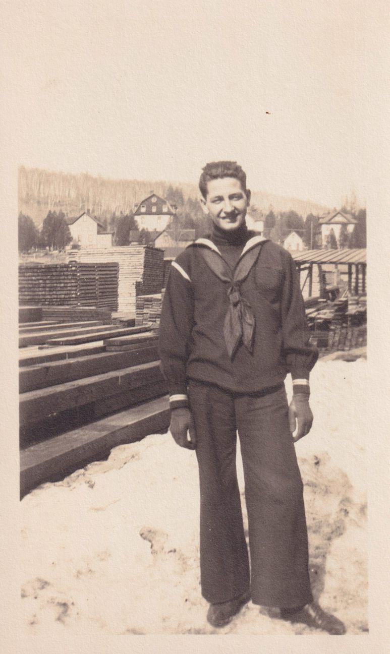 Black-and-White photograph of an unidentified man in a WWI-era naval uniform standing outside in the snow. The Branch & Callanan Lumberyard is visible behind him. Several houses on lower Broadway can be seen in the distance, including 154 Broadway [155]. The photograph was likely printed by Kollecker's Kodak and Gift Shop.