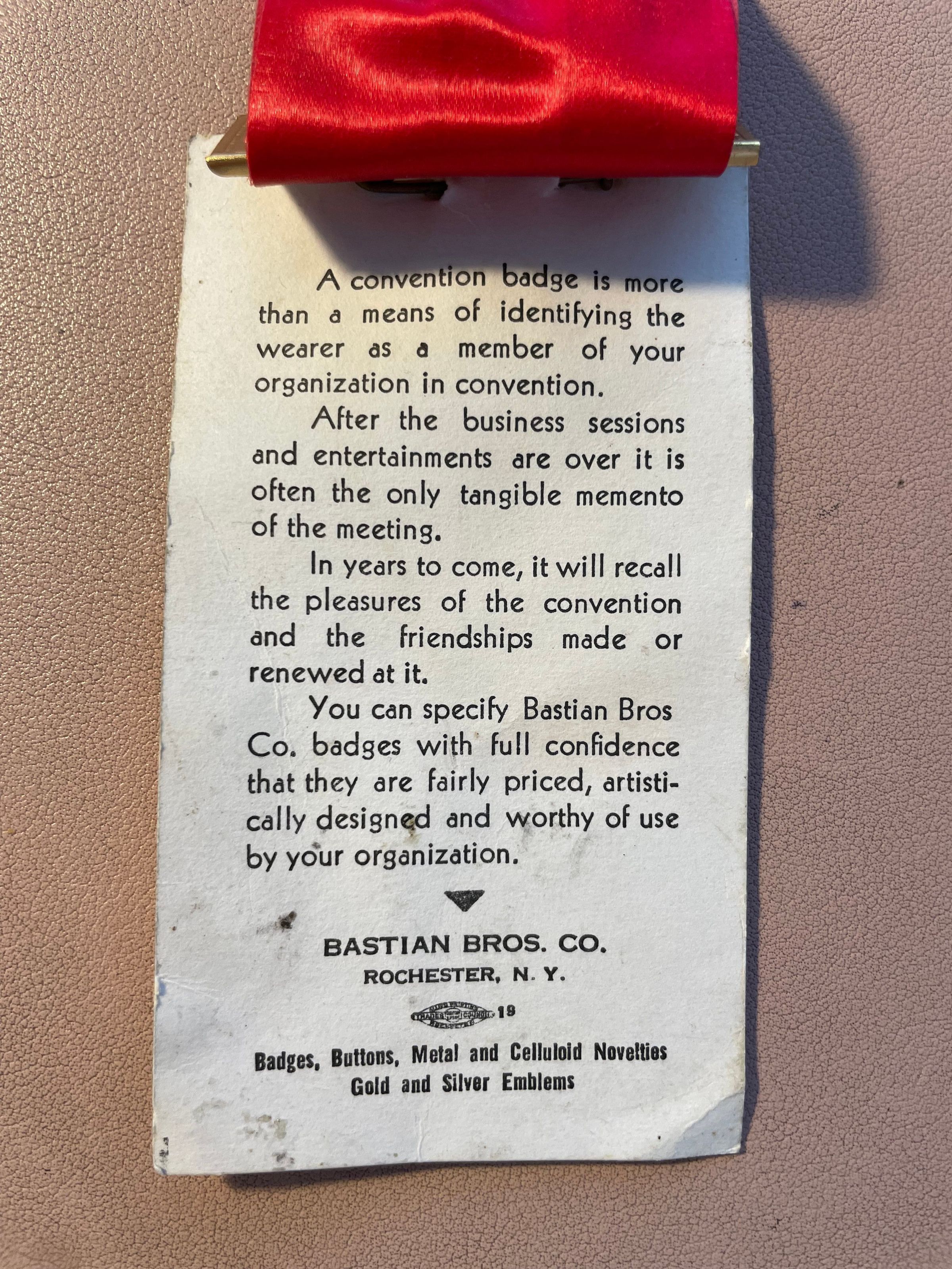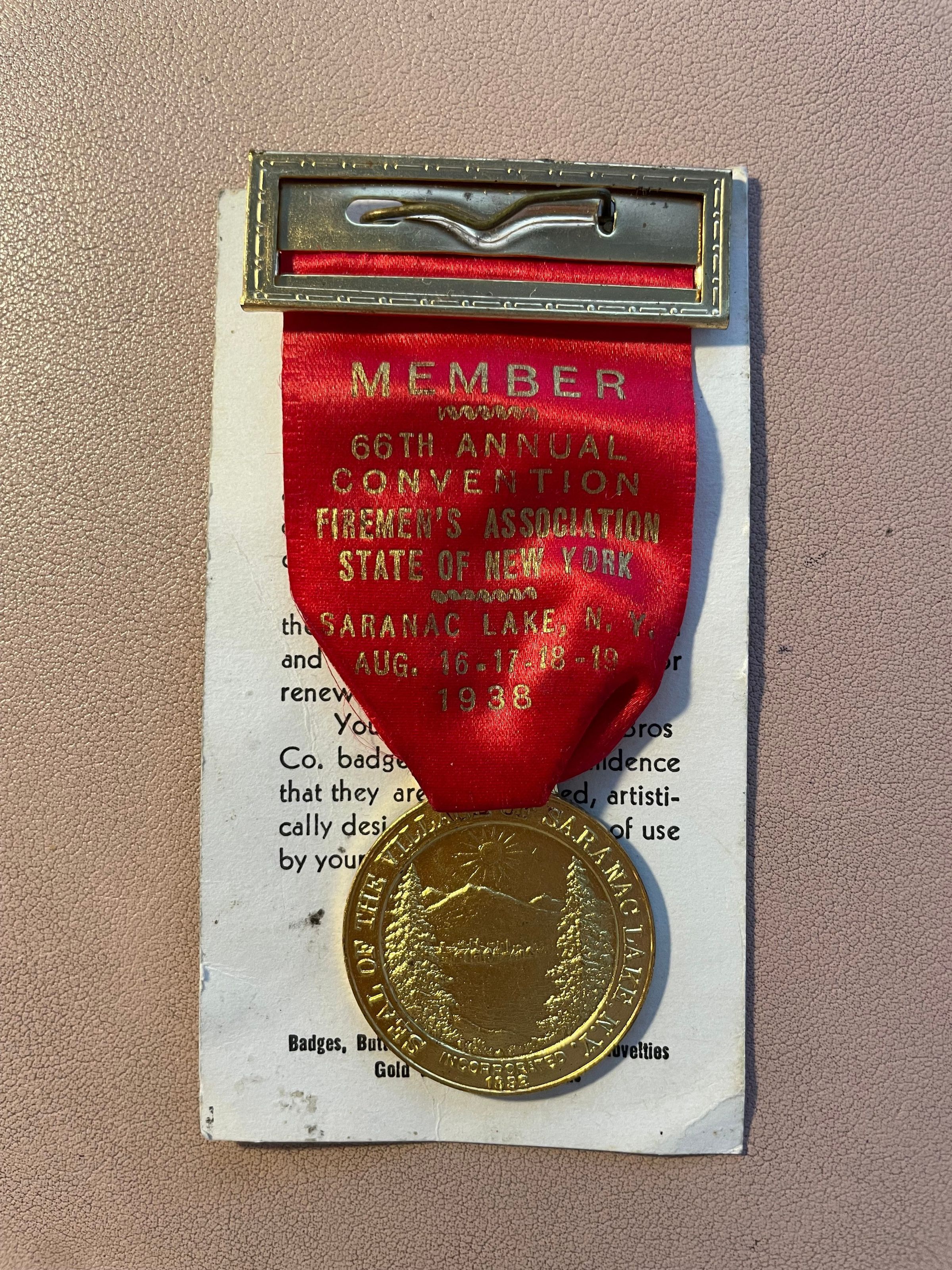 Souvenir nametag from the State of New York Firemen's Association 66th Annual Convention in Saranac Lake, August 16-19, 1938. Has gold nametag holder with pin back, red ribbon, and gold medal at bottom. Gold medal reads, "Seal of the Village of Saranac Lake, N.Y., incorporated 1892." Ribbon reads, "Member - 60th Annual Convention, Firemen's Association, State of New York. Saranac Lake, N. Y., Aug. 16-17-18-19, 1938." Pinned to paper backing advertising the Bastian Bros. Company, Rochester.Collection