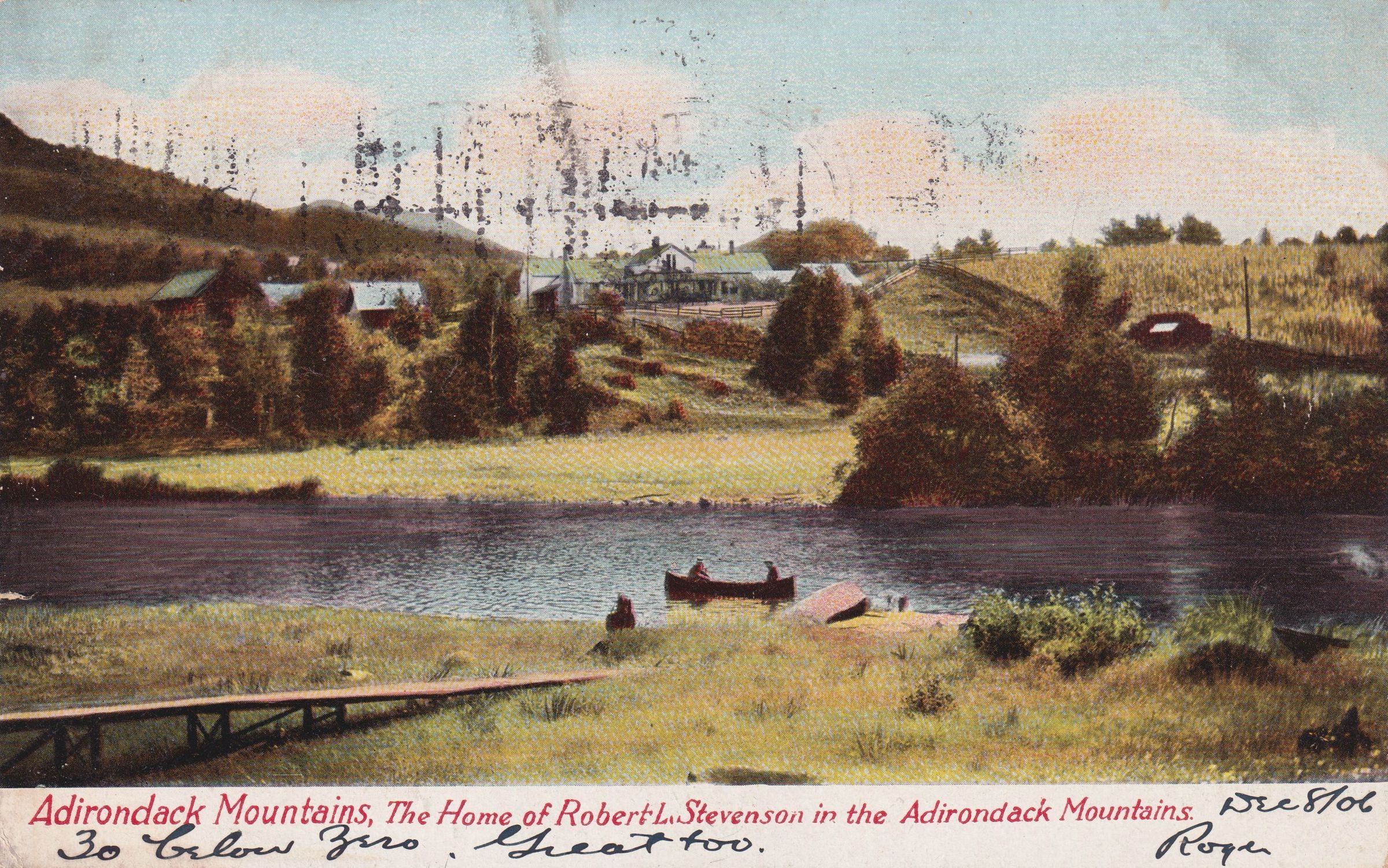 Color postcard showing the view of the Robert Louis Stevenson Cottage across the Saranac River. Two people can be seen in a boat on the river. Printed caption on front reads, "Adirondack Mountains, the Home of Robert L. Stevenson in the Adirondack Mountains." Printed by the Hugh C. Leighton Co., Portland, ME. Used, undivided back, white space at bottom front for message, postmarked Saranac Lake, December 10, 1906.