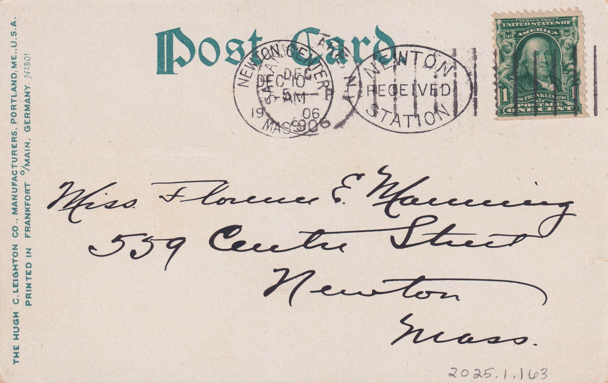 Handwritten message on front reads, "Dec. 8/06. 30 below zero. Great too. Roger." Mailed to Miss Florence E. Manning, 559 Center Street, Newton, Mass.Subject Place