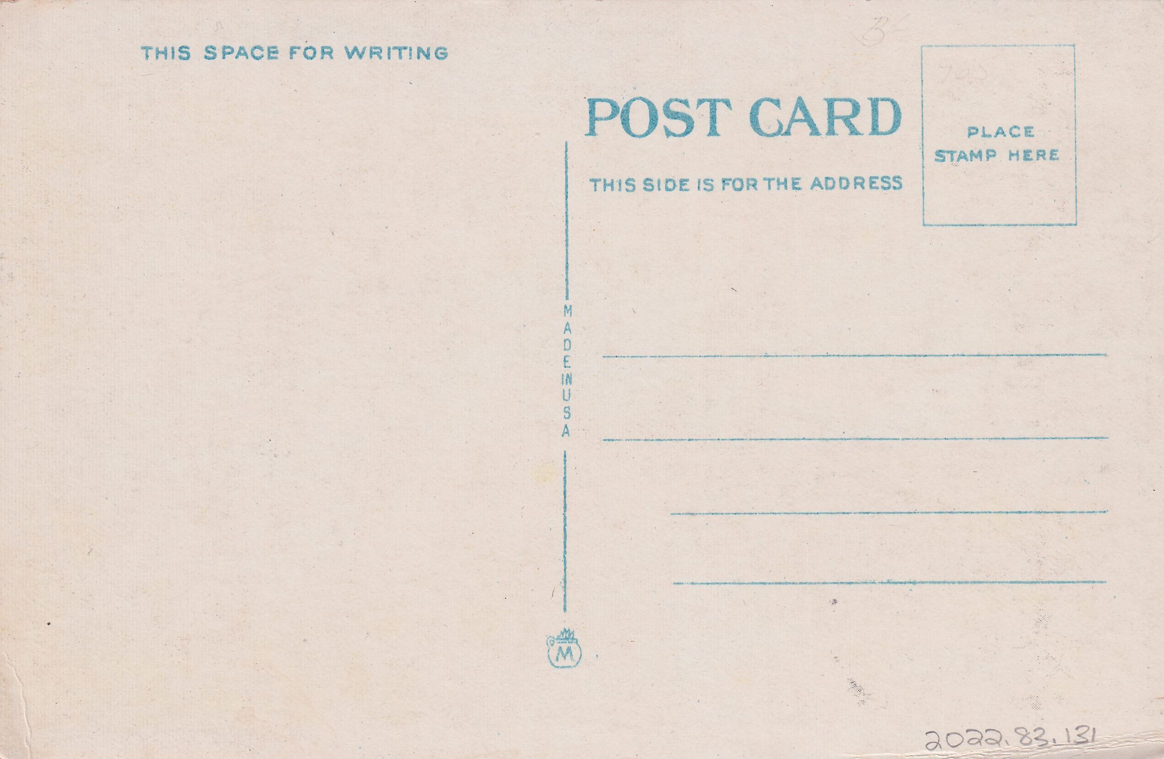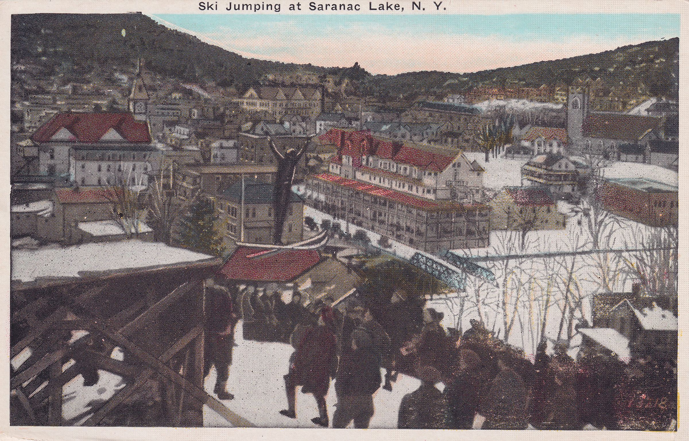 Color postcard showing a ski jumper launching off of Blood Hill/Lake Street Hill. The village of Saranac Lake is visible in the background, and there are spectators standing on the hill. Printed caption on front reads, "Ski Jumping at Saranac Lake, N. Y." No printer's mark. Unused, divided back, white border.Subject Place