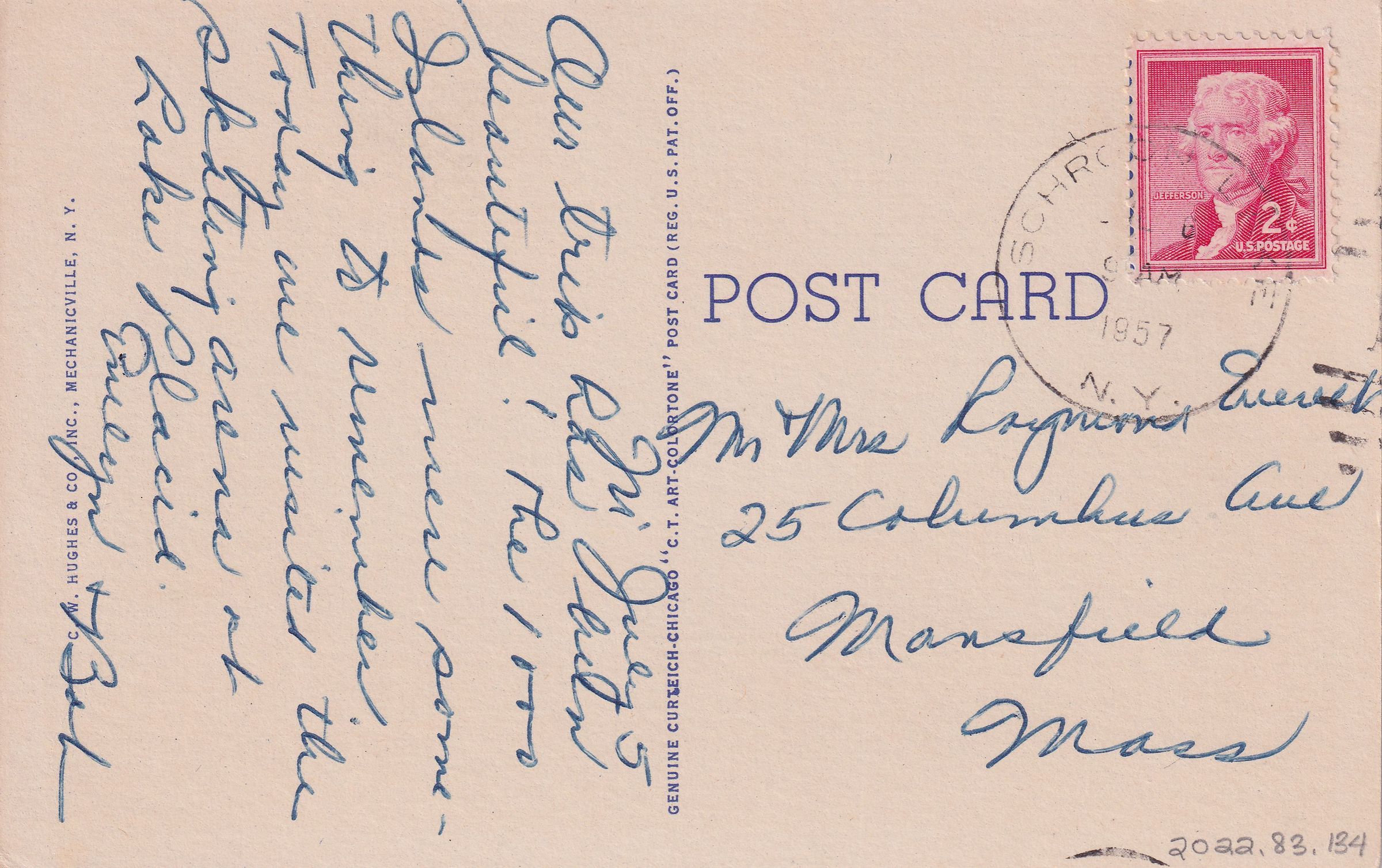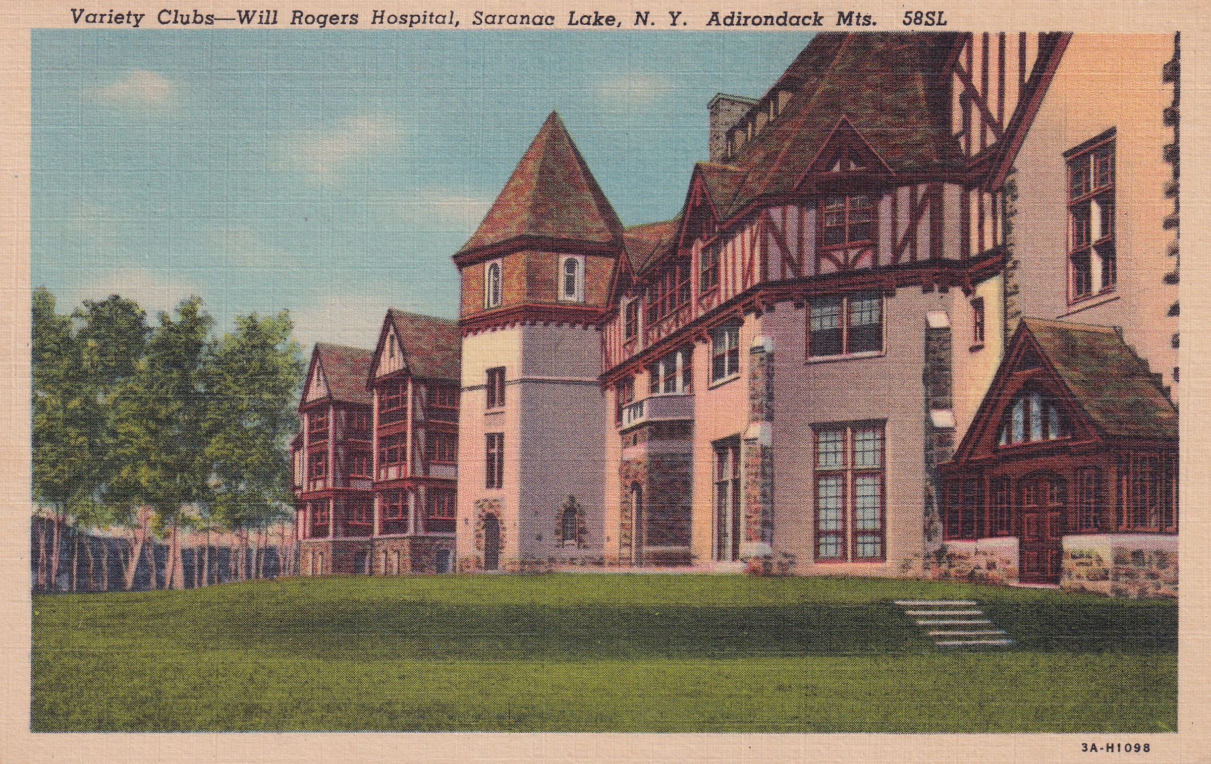 Color postcard showing the west face of Will Rogers Memorial Hospital. Printed caption on front reads, "Variety Clubs--Will Rogers Hospital, Saranac Lake, N. Y., Adirondack Mts." Printed by C. W. Hughes & Co., Inc., Mechanicville, NY. Used, divided back, white border, postmarked Schoon Lake, NY, July 6, 1957. Handwritten message on back reads, "Fri. July 5. Our trip has been beautiful! The 1000 Islands were something to remember. Today we visited the skating arena at Lake Placid. Evelyn + Bob." Mailed to Mr. + Mrs. Raymond Everest, 25 Columbus Ave. Mansfield, Mass.Collection