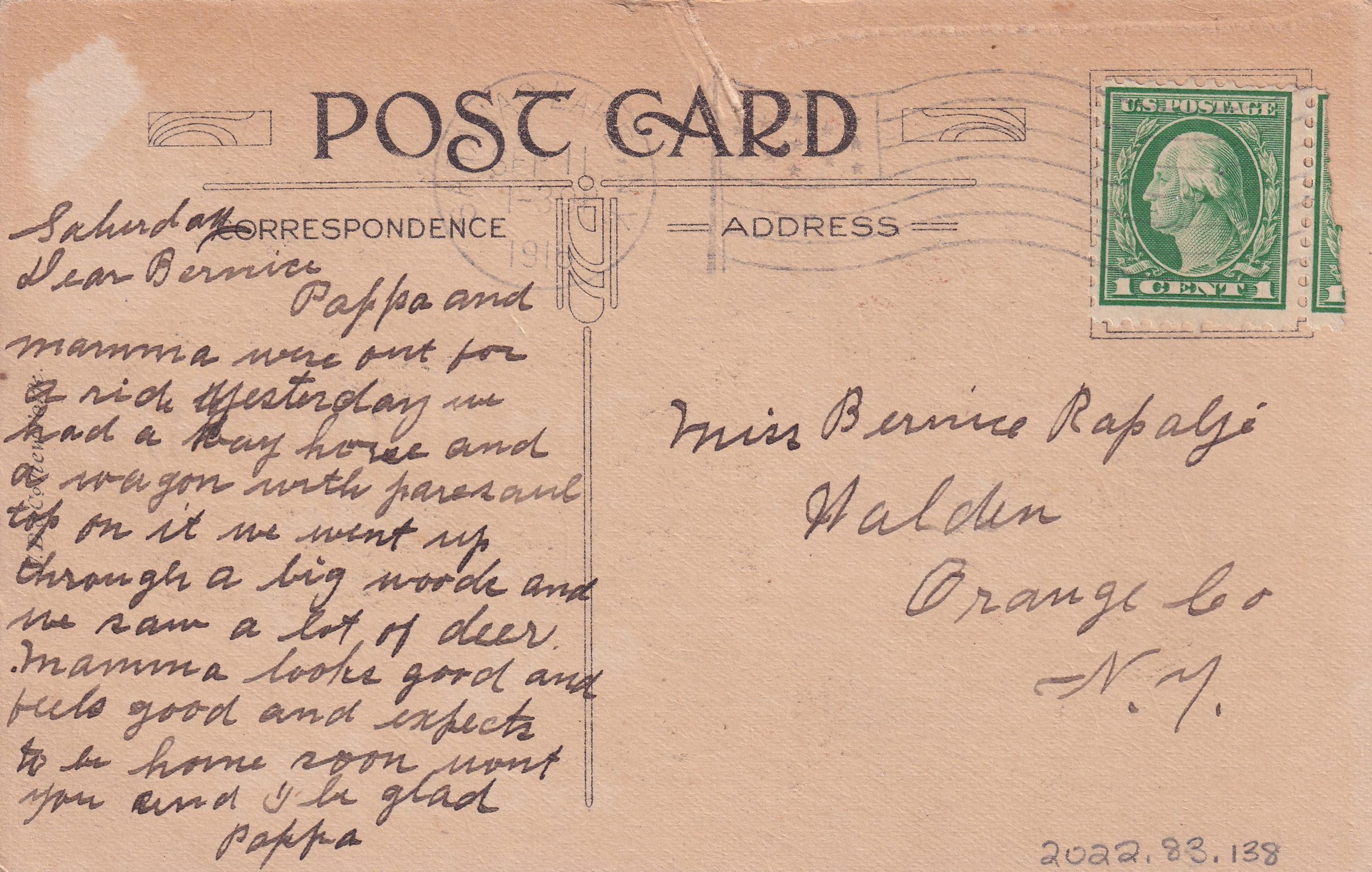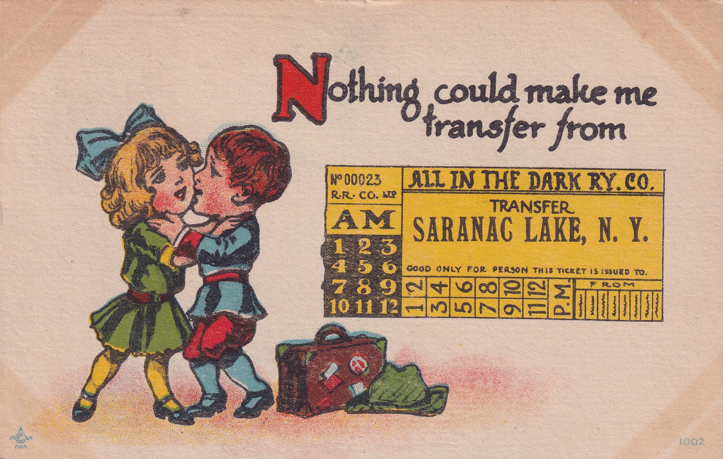 Color postcard with a cartoon of a boy and girl. Features an illustration of a railroad ticket, and reads, "Nothing could make me transfer from Saranac Lake, N. Y." No printer's mark. Used, divided back, postmarked Saranac Lake, September 11, 1916. Handwritten message on back reads, "Saturday. Dear Bernice, Pappa and mamma were out for a ride yesterday we had a bay horse and a wagon with parasaul [sic] top on it we went up through a big woods and we saw a lot of deer. Mamma looks good and feels good and expects to be home soon won't you and I be glad. Pappa." Mailed to Miss Bernice Rapaye [?], Walden, Orange Co., N. Y.Collection
