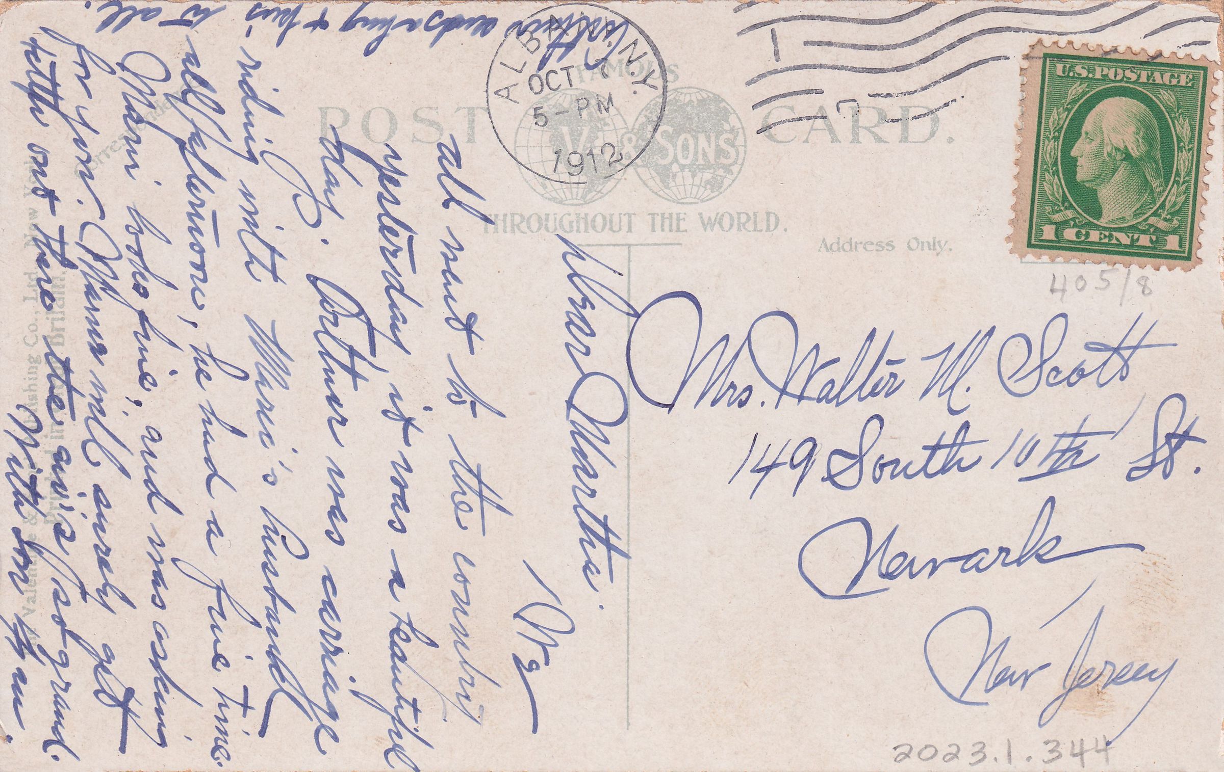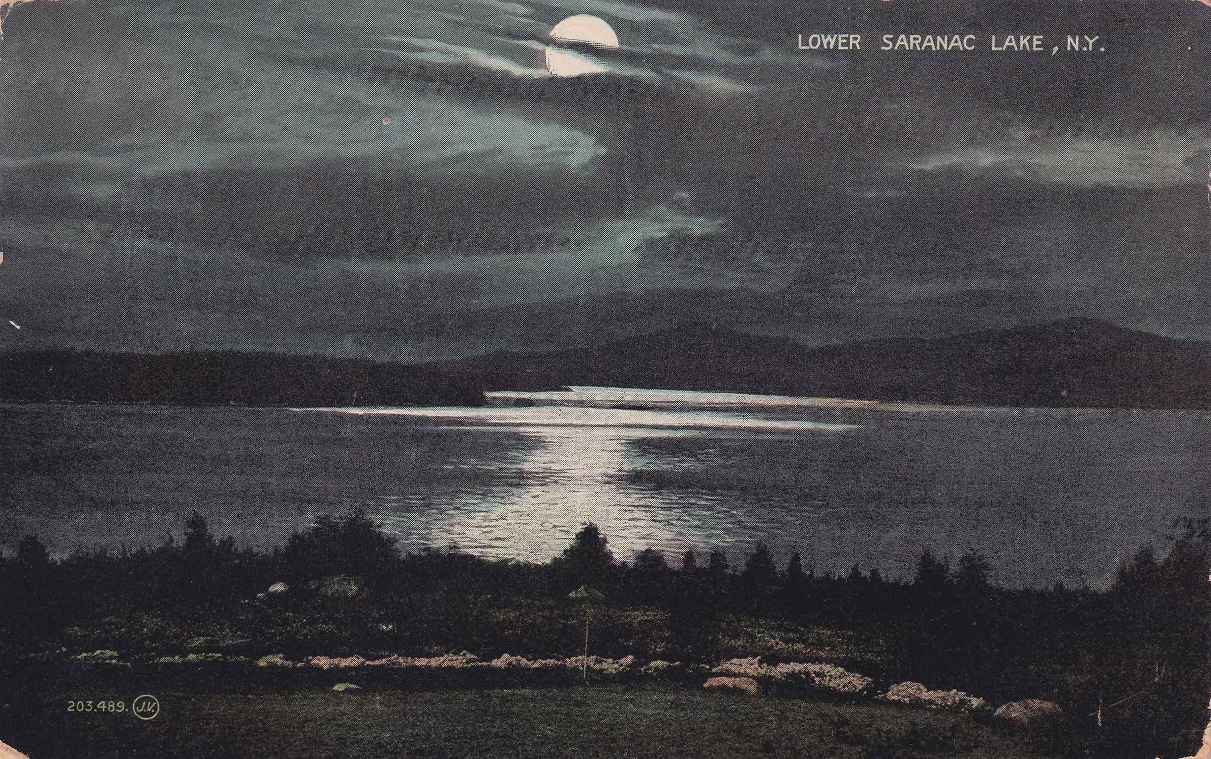 Color postcard showing a view of a lake with a full moon above. Printed caption on front reads, "Lower Saranac Lake, N. Y." Printed by the Valentine & Sons' Publishing Co., Ltd., New York. Used, divided back, postmarked Albany, NY, October 7, 1912. Handwritten message on back reads, "Dear Martha, We all went to the country yesterday, it was a beautiful day. Arthur was carriage riding with Marie's husband all afternoon, he had a fine time. Marie looks fine, and was asking for you. Mama will surely get better out there the air is so grand. With [?]. Arthur sends a hug & kiss to all." Mailed to Mrs. Walter M. Scott, 149 South 10th St., Newark, New Jersey.Subject Place