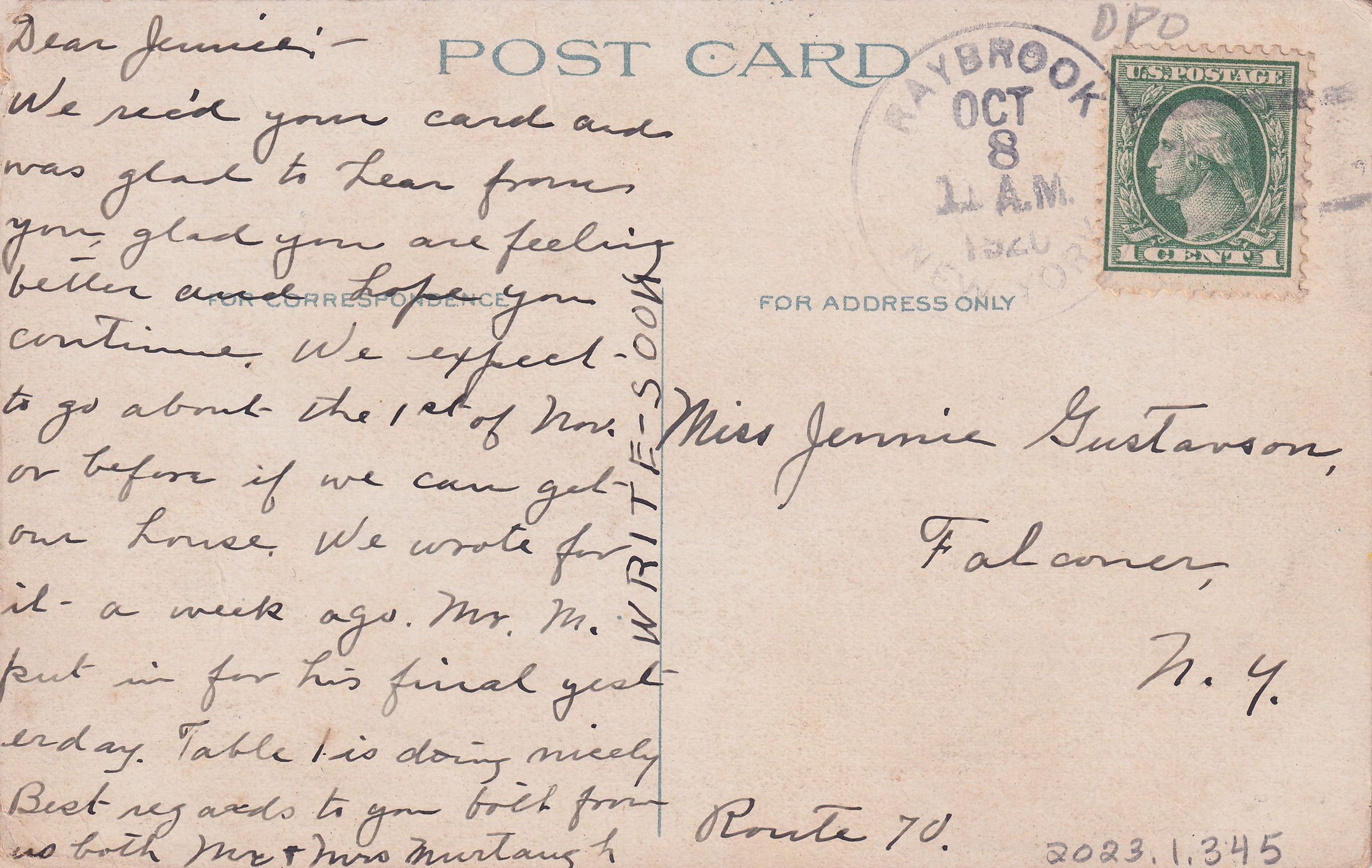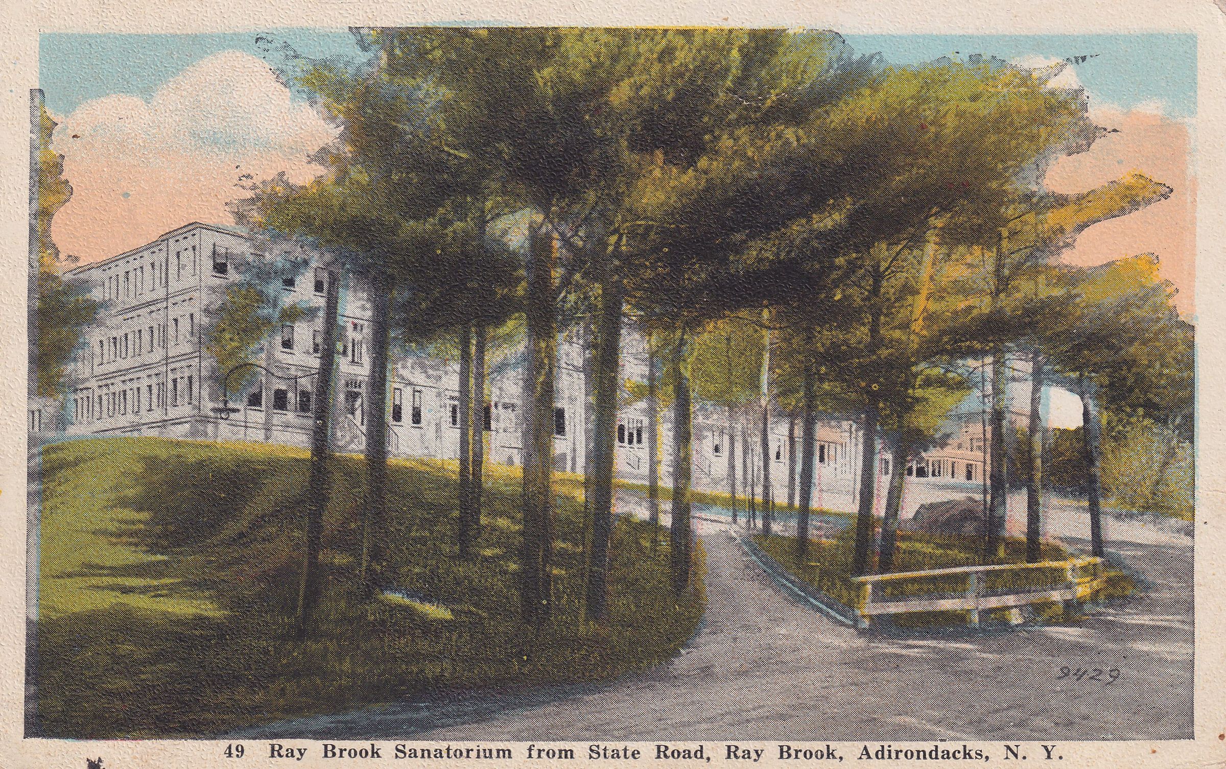 Color postcard showing a view of the Main Building at the New York State Hospital for Incipient Tuberculosis, AKA Ray Brook Sanatorium. The building can be seen behind trees. Printed caption on front reads, "Ray Brook Sanatorium from State Road, Ray Brook, Adirondacks, N.Y." No printer's mark. Used, divided back, white border, postmarked Ray Brook, NY, October 8, 1920. Handwritten message on back reads, "Dear Jennie- We rec'd your card and was glad to hear from you. Glad you are feeling better and hope you continue. We expect to go about the 1st of Nov. or before if we can get our house. We wrote for it a week ago. Mr. M. put in for his final yesterday. Table 1 is doing nicely. Best regards to you both from us both Mr. & Mrs. Murtaugh. Write soon." Mailed to Miss Jennie Gustavson, Falconer, N. Y. Route 70.Subject Place