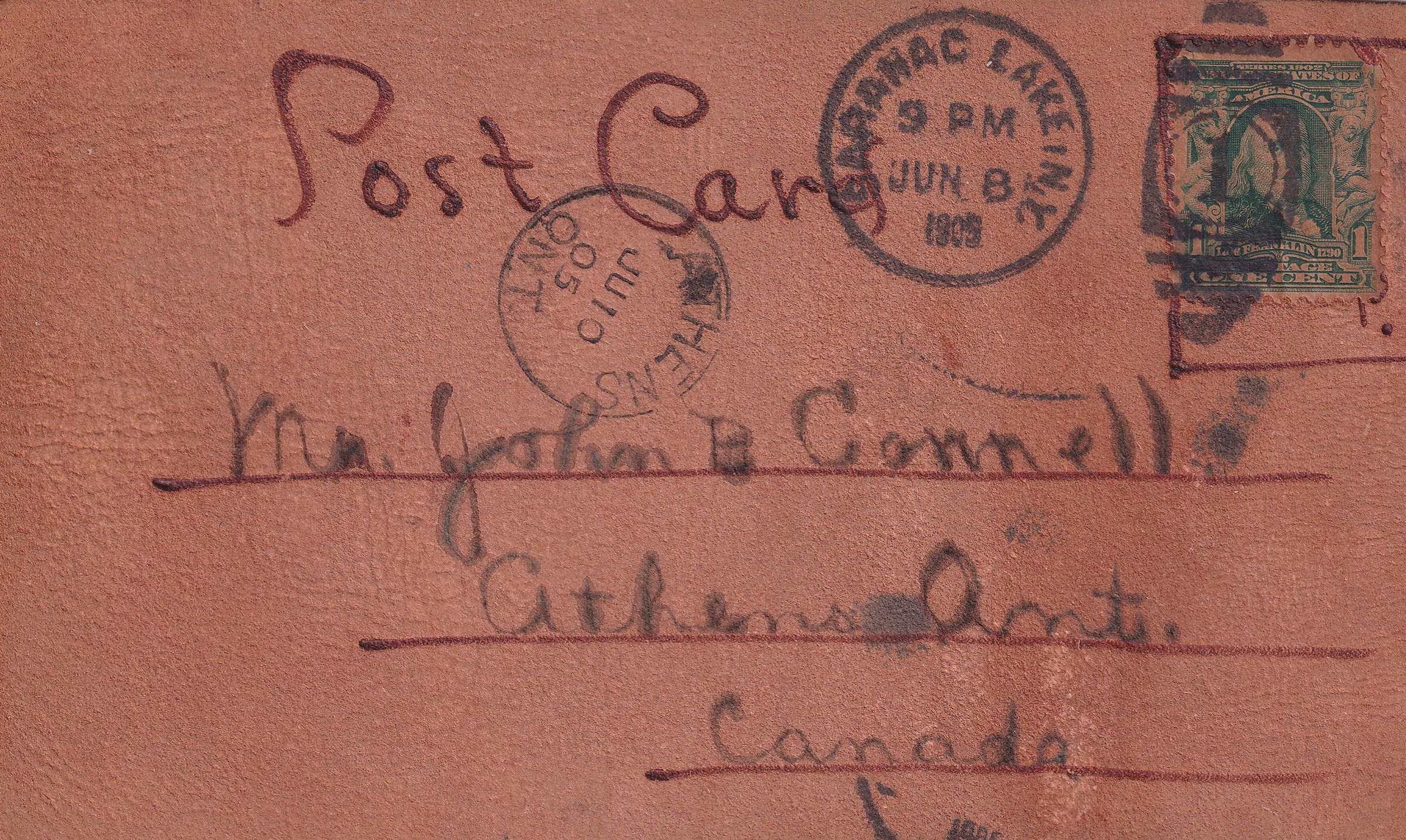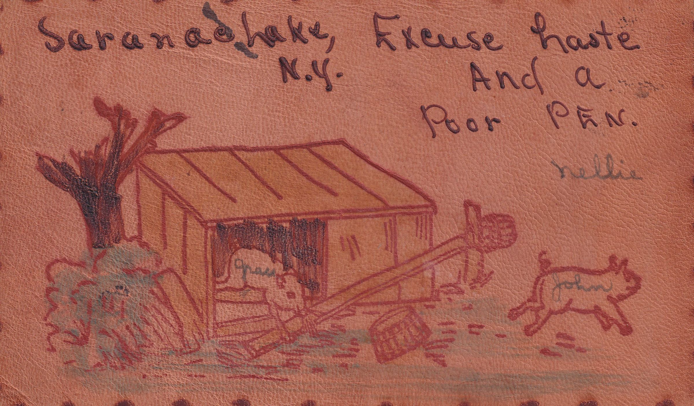 Leather postcard with drawing of pigs escaping a pigpen. Caption on front reads, "Saranac Lake, N. Y. Excuse haste and a poor pen." The card is signed "Nellie" on the front, and the two pigs have been labeled as "Gran," and "John." No printer's mark. Postmarked Saranac Lake, June 8, 1905. Mailed to Mr. John B. Connell, Athens, Ont. Canada.Collection