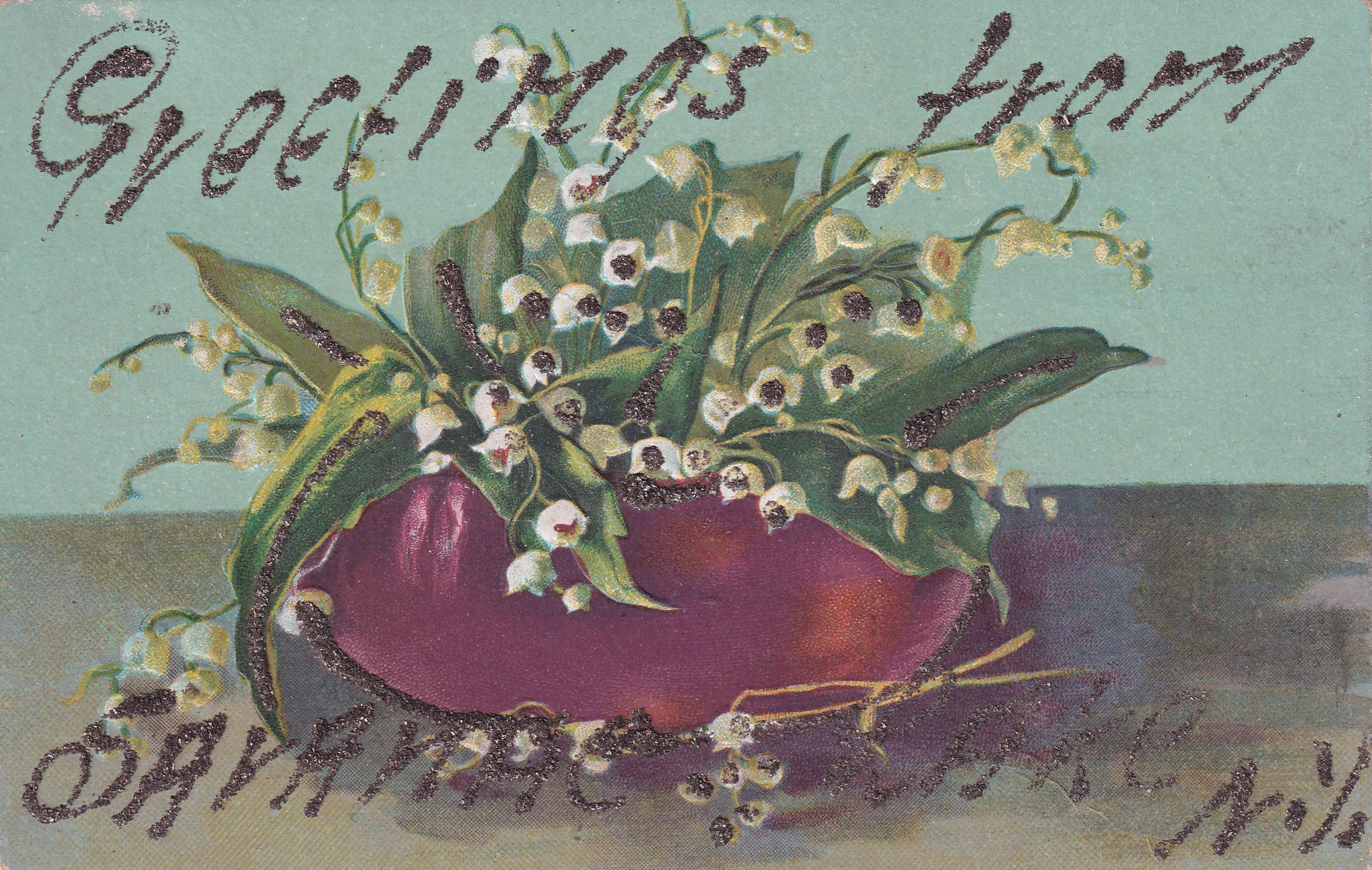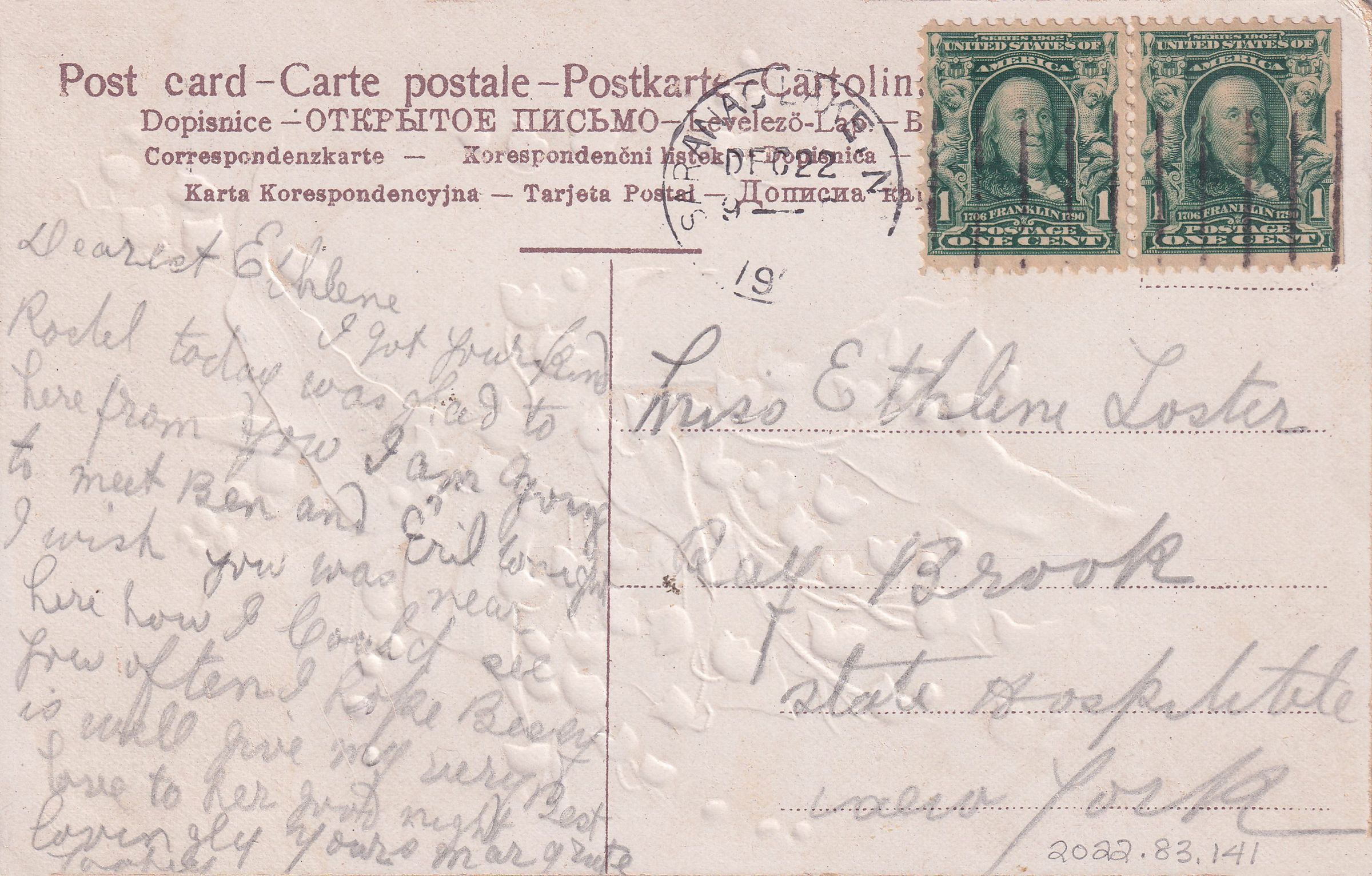Color postcard with drawing of a flowering plant. Glitter letters on front read, "Greetings from Saranac Lake, N. Y." No printer's mark. Used, divided back, postmarked Saranac Lake, December 22, 19[??]. Handwritten message on back reads, "Dearest Ethlene. I got your kind postal today was glad to here from you. I am going to meet Ben and Eril tonight. I wish you was near here how I would see you often. I hope Becky is well. Give my very best love to her. good night. lovengly yours. Margrete Loster." Mailed to Miss Ethlene Loster, Ray Brook, State Hospitable [sic], New York.Collection