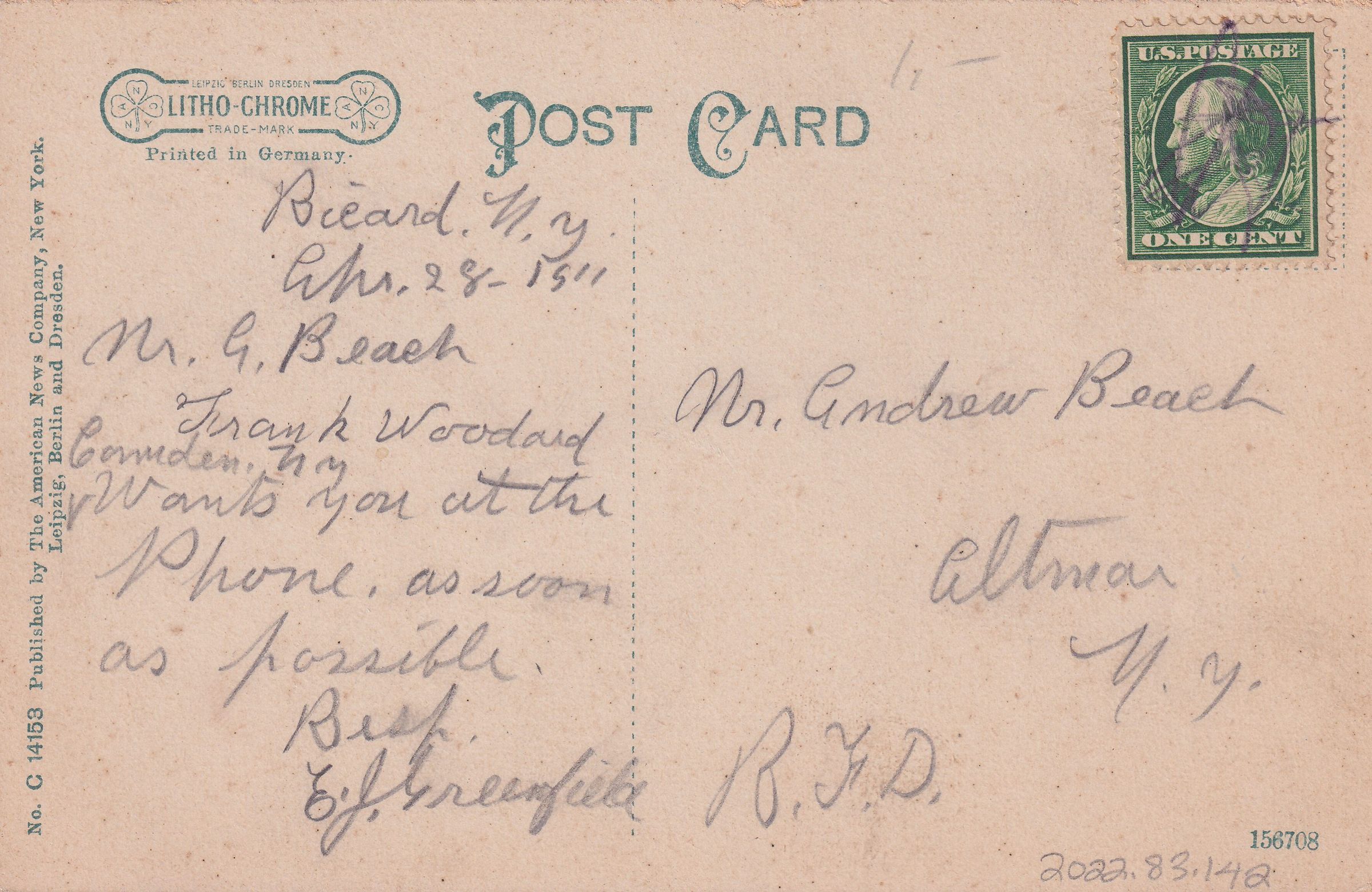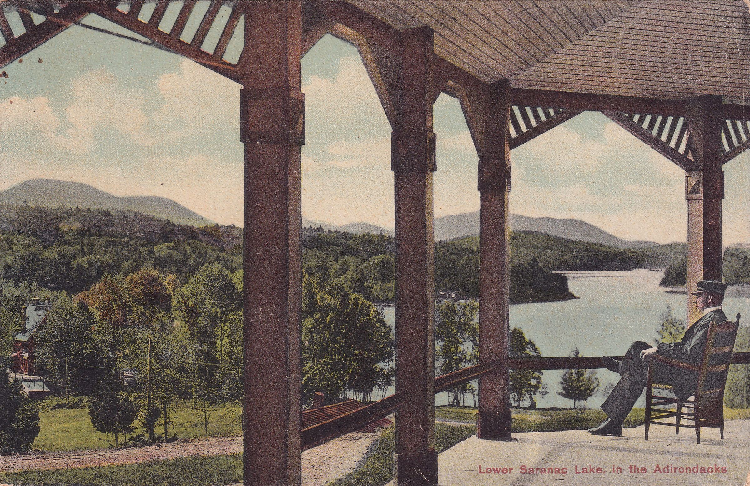 Color postcard showing the view off of the Hotel Algonquin porch toward Lower Saranac Lake. There is a man seated in a chair on the porch. Printed caption on front reads, "Lower Saranac Lake, in the Adirondacks." Printed by the American News Company, New York. Used, divided back, no postmark. Handwritten message on back reads, "Ricard, N. Y., Apr. 28, 1911. Mr. A. Beach, Frank Woodward, Camden, N.Y, wants you at the phone as soon as possible. Best, E. J. Greenfield." Mailed to Mr. Andrew Beach, Altman, N. Y., R. F. D.Subject Place