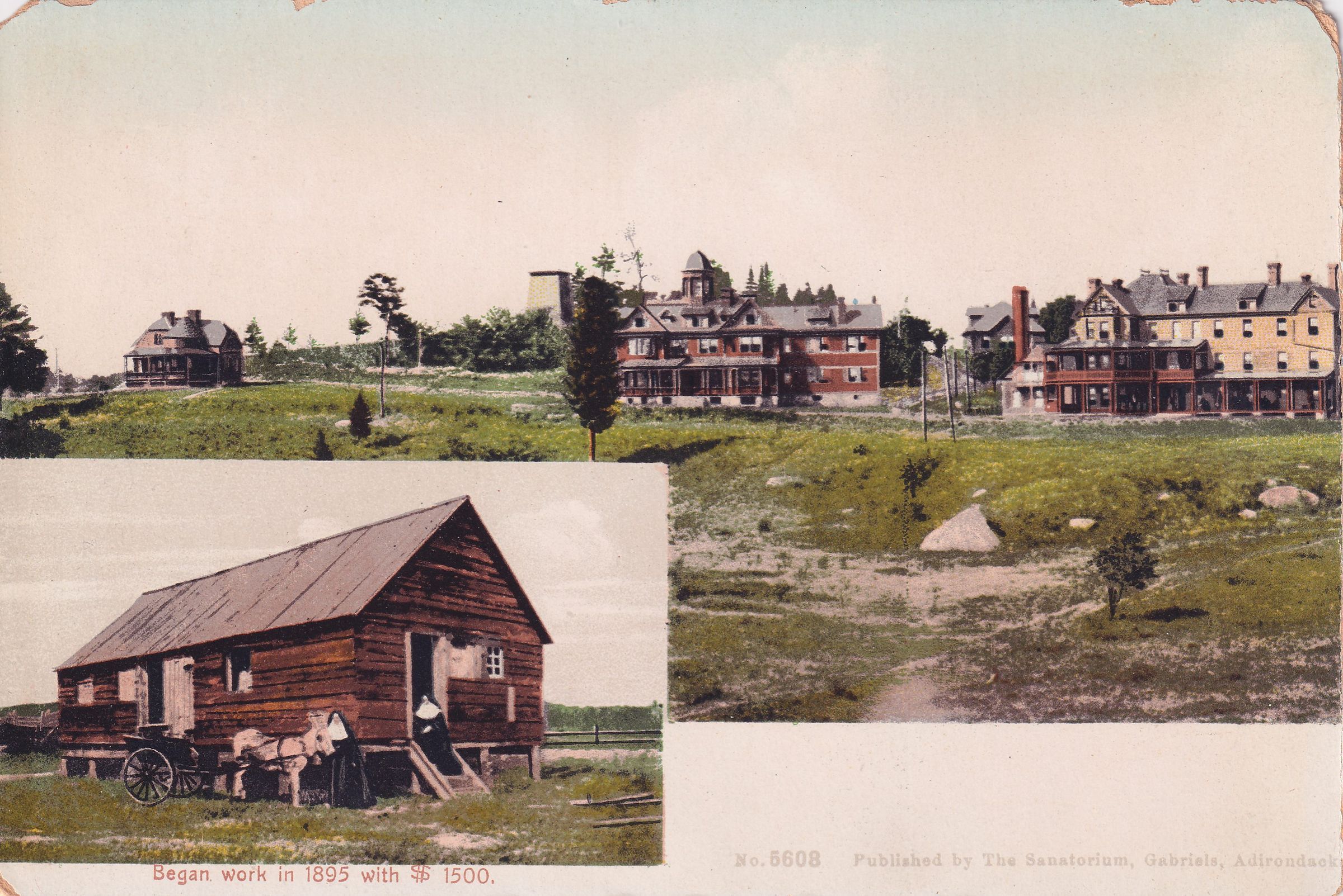 Color postcard showing an early view of the grounds at Gabriels Sanatorium, with an inset view of a small barn. There are two nuns and a donkey standing by the barn. Printed caption on front reads, "Began Work in 1895 with $1500." Printed by the Sanatorium, Gabriels, Adirondacks. Unused, undivided back, white space on front for message.Subject Place