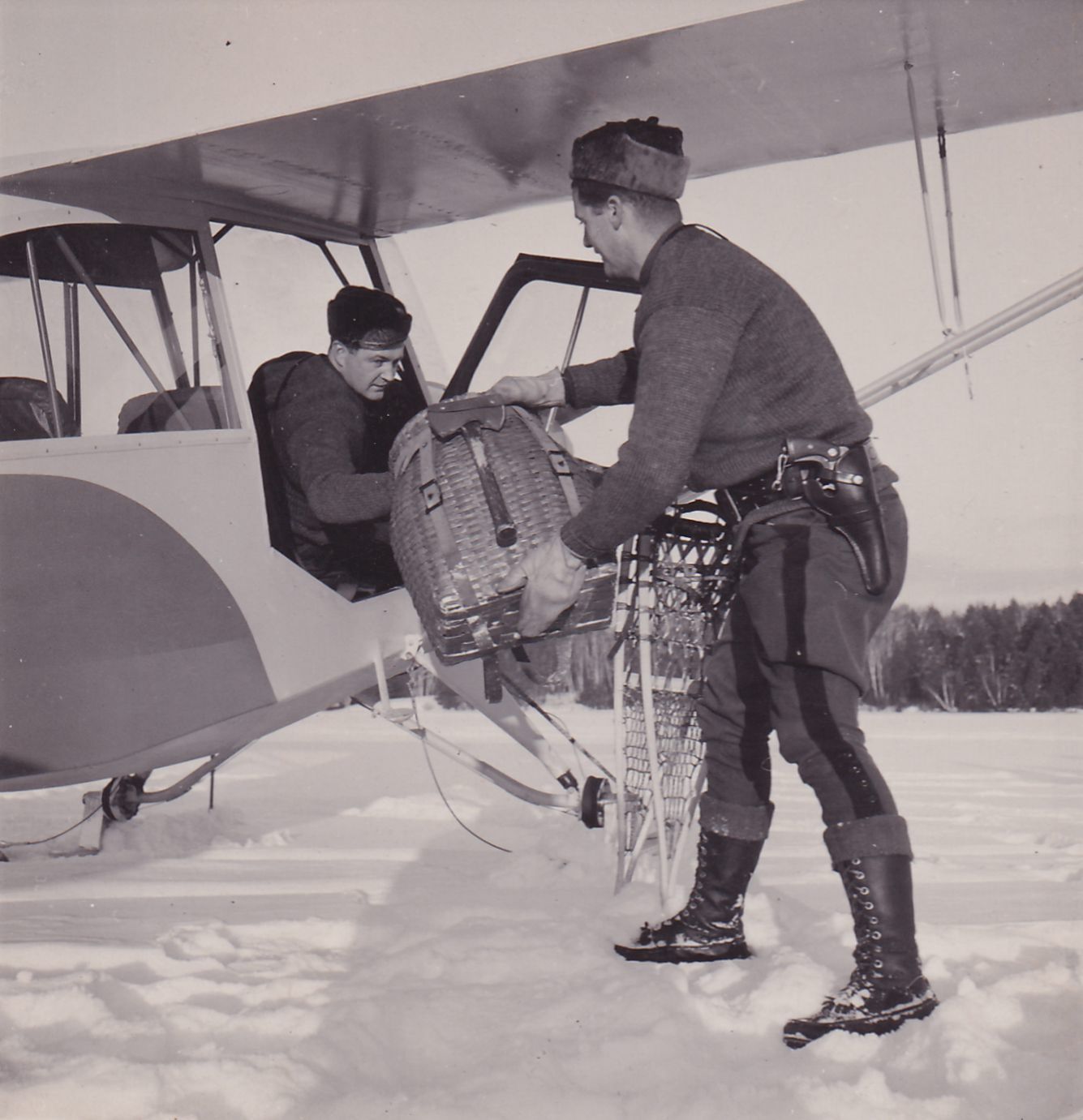 Black-and-White photograph of two men in game warden uniforms. One is passing a pack basket to the other, who is seated in a small plane. There is a pair of snowshoes leaning against the plane. The man at right may be Carl Prue.