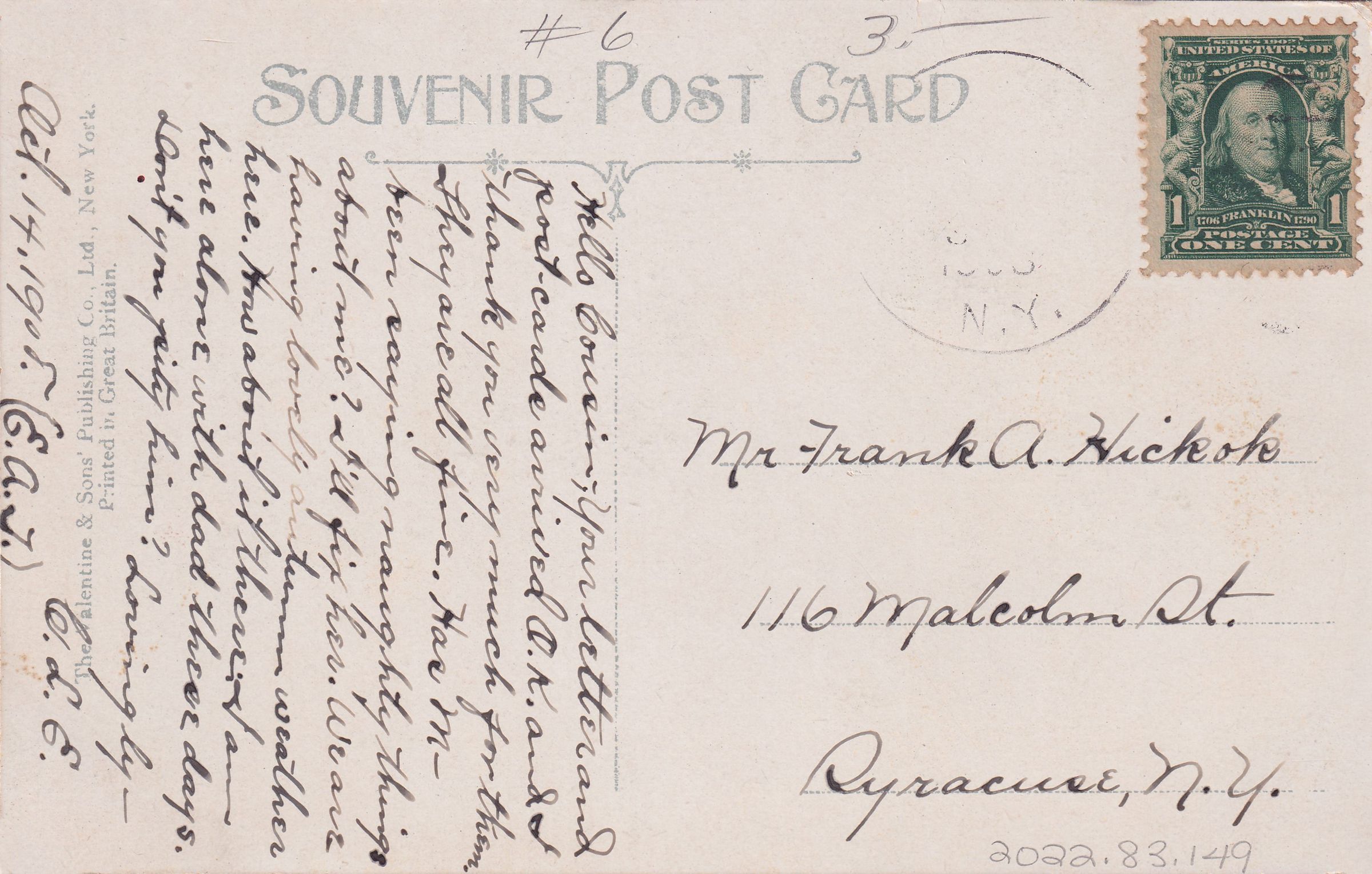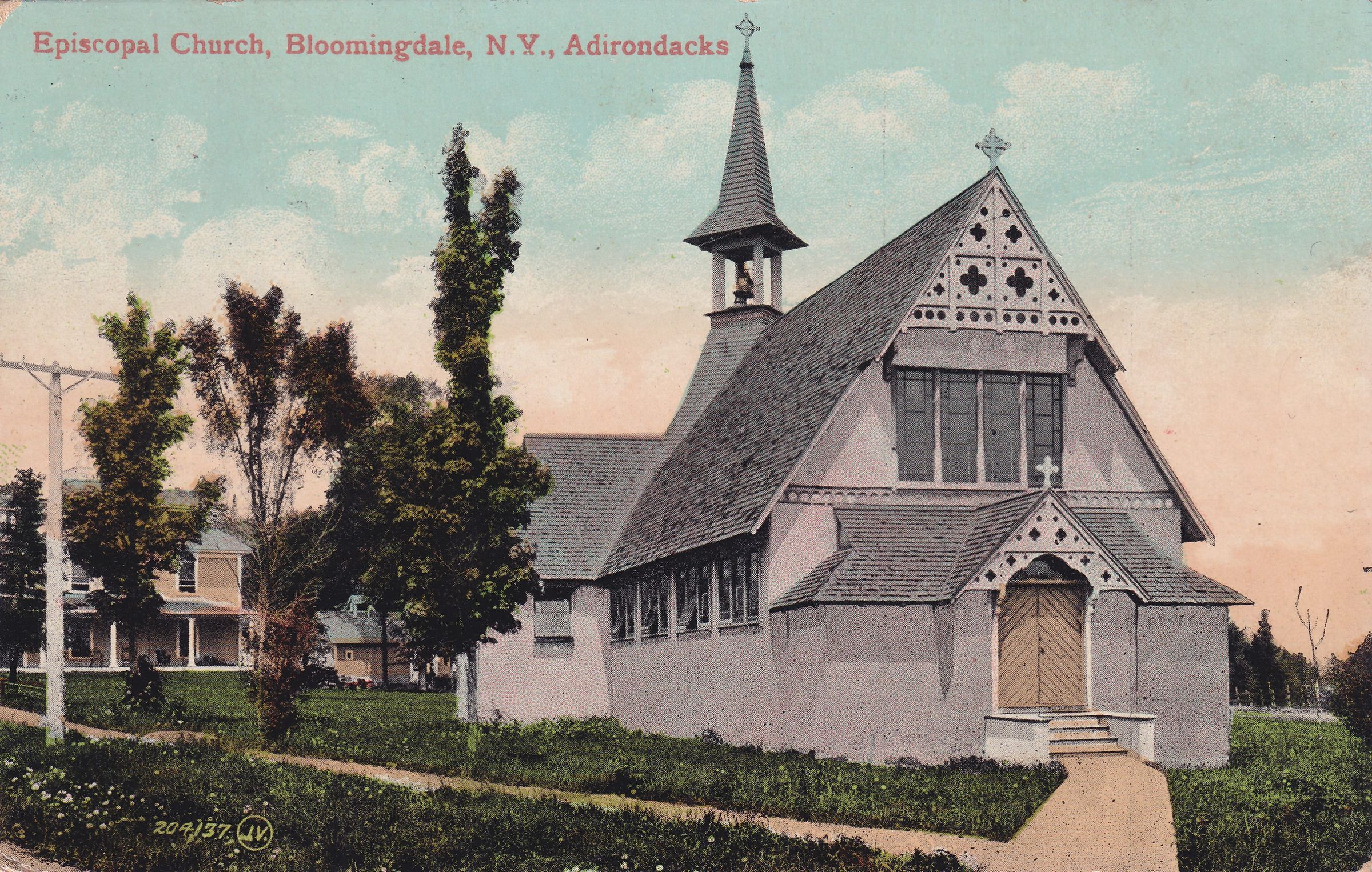 Color postcard showing the Episcopal Church in Bloomingdale, looking north. The house on St. Regis Avenue is partially visible behind it. Printed caption on front reads, "Episcopal Church, Bloomingdale, N. Y., Adirondacks." Printed by the Valentine & Sons' Publishing Co., Ltd., New York. Used, divided back, postmark illegible. Handwritten message on back reads, "Hello, Cousin,-- Your letter and. post-cards arrived O.K. and I thank you very much for them. They are all fine. Has M-- been saying naughty things about me? I'll fix her. We are having lovely autumn weather here. How about it there? I am here alone with dad these days. Don't you pity him? Lovingly-- C. L. E. Oct. 14, 1908. (E.A.J.)" Mailed to Mr. Frank A. Hickok, 116 Malcolm St., Syracuse, N. Y.Subject Place