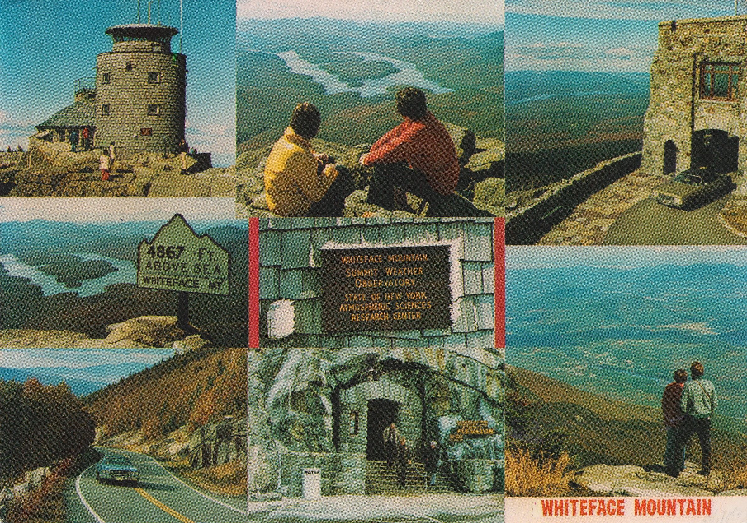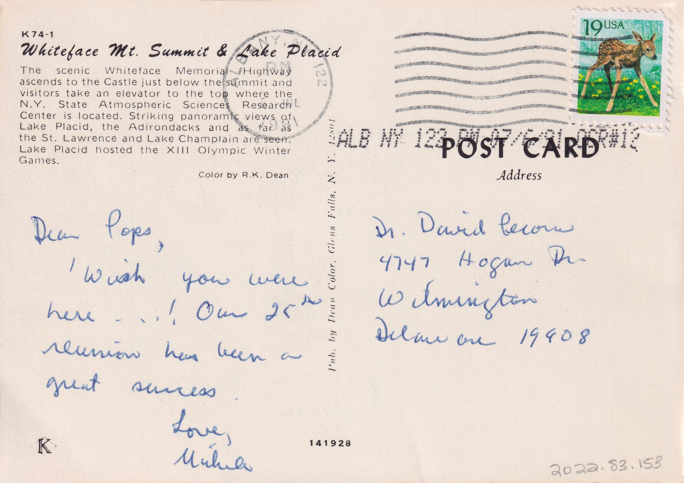 Color postcard showing eight views of Whiteface Mountain, the Whiteface Memorial Highway, and the Summit Observatory. Printed caption on front reads, "Whiteface Mountain." Printed by Dean Color, Glens Falls, NY. Used, divided back, postmarked Albany, NY, July 1991. Handwritten message on back reads, "Dear Pops, I wish you were here..! Our 25th reunion has been a great success. Love, Michele." Mailed to Dr. David Pecora, 4747 Hogan Dr., Wilmington, Delaware, 19808.Subject Person/Organization