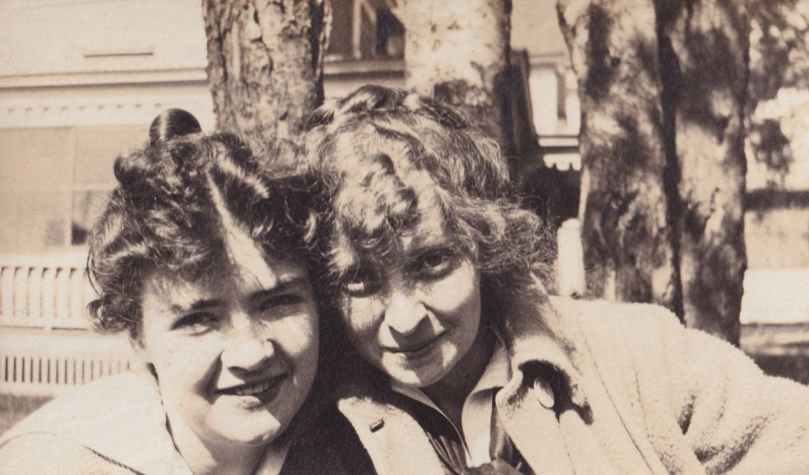 Black-and-white photograph of two women standing together outside. Their faces are close to the camera. There is a tree and cure cottage porch behind them.