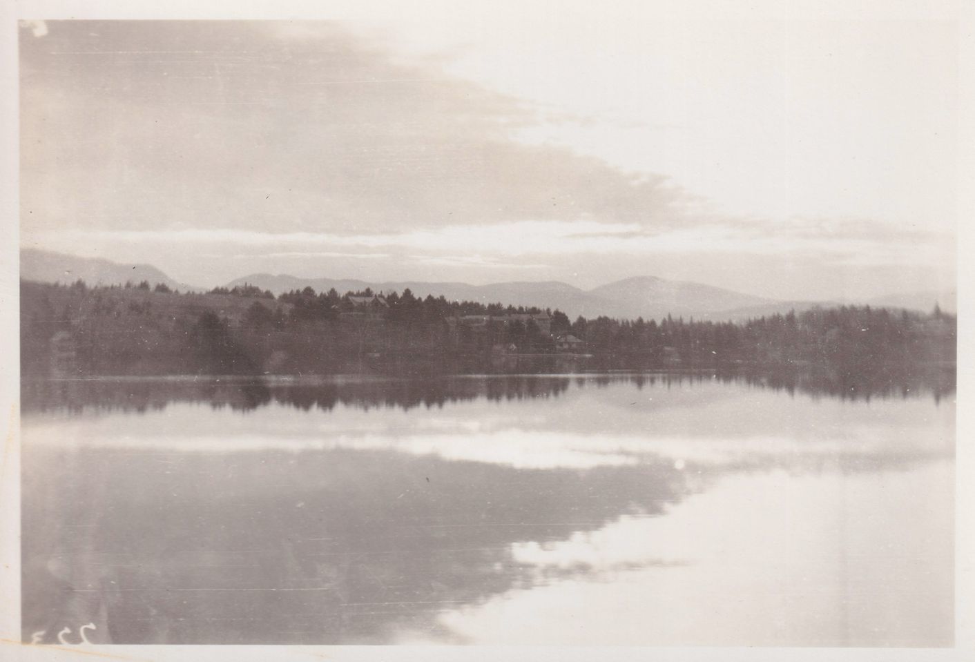 Black-and-White photograph of an unidentified body of water. A few buildings are visible on the opposite shore and mountains can be seen in the distance. The photograph was likely printed by Kollecker's Kodak and Gift Shop.