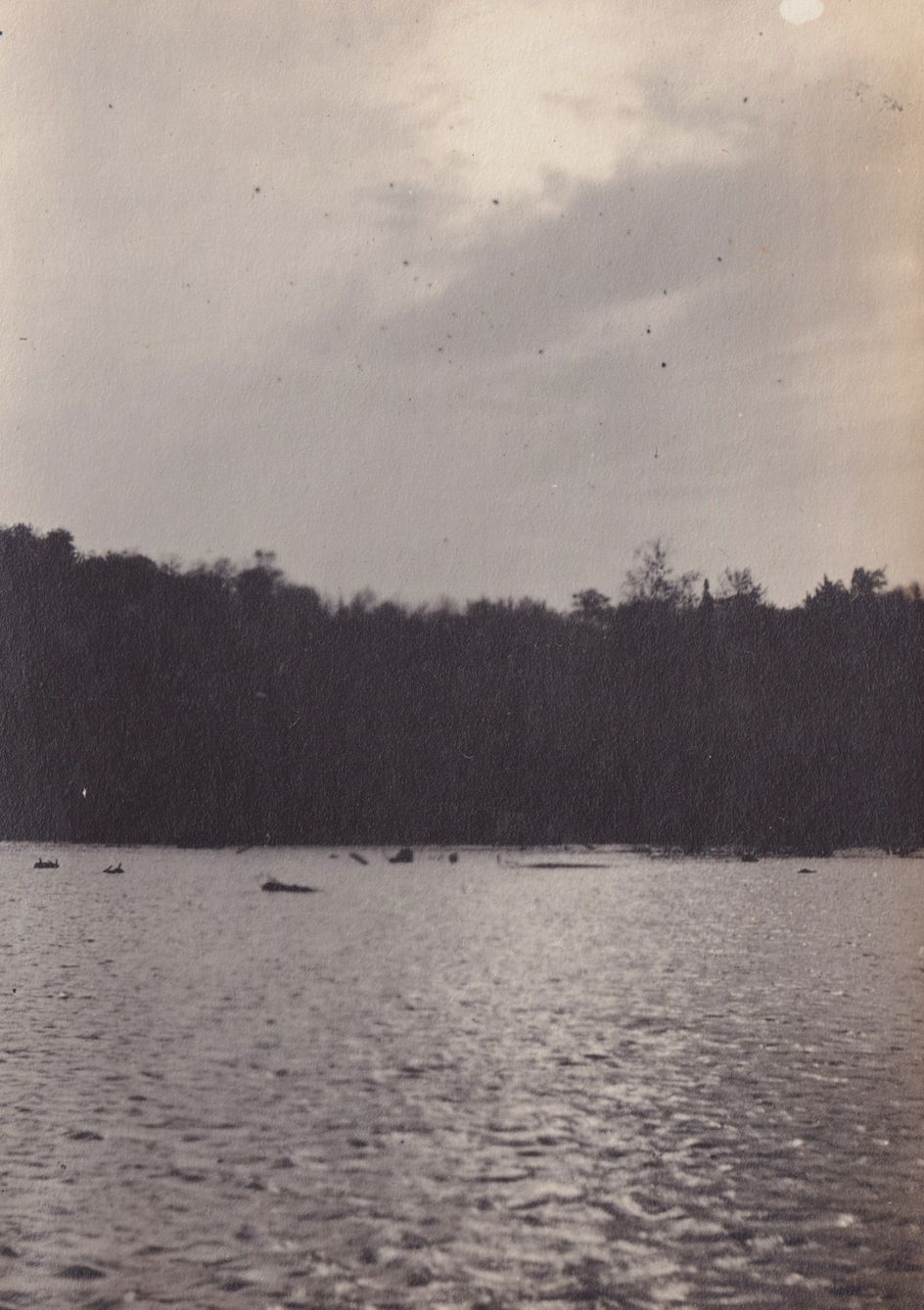 Black-and-white photograph taken from a lake or similar body of water, looking over the water's surface to the tree line at the shore. There is a dense forest at the shoreline.