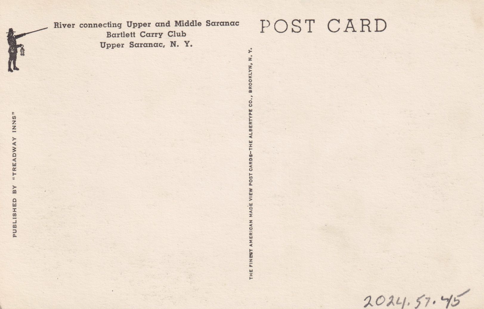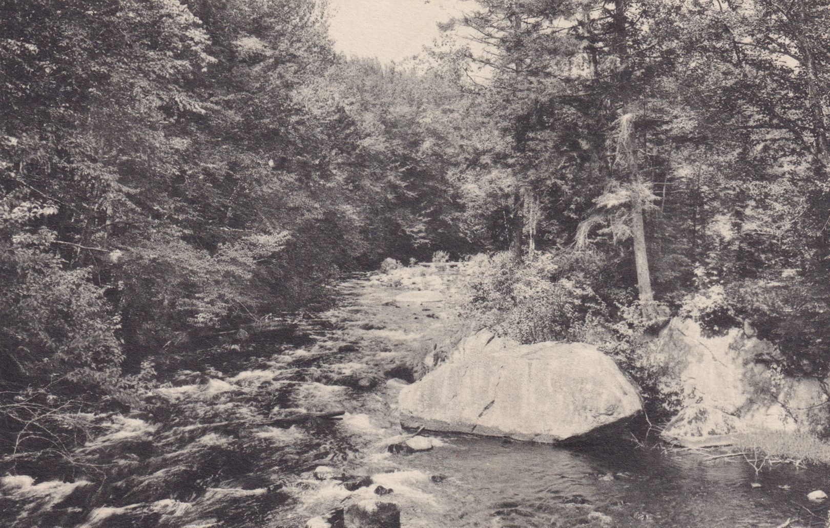 Black-and-White postcard showing a river with large rocks. Printed caption on reverse reads, "River connecting Upper and Middle Saranac, Bartlett Carry Club, Upper Saranac, N. Y." Printed by Treadway Inns/the Albertype Co., Brooklyn, NY. Unused, divided back.Subject Place