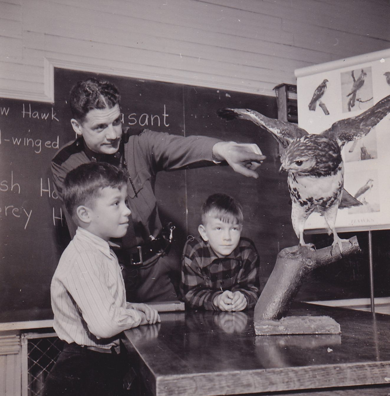 Black-and-White photograph of a man in a game warden uniform in a classroom. He is pointing at a taxidermied bird while two students look on.
