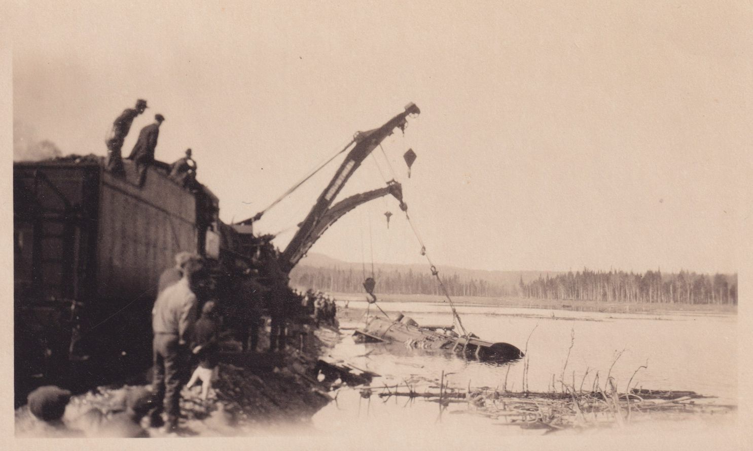 Black-and-White photograph of workers using cranes to pull a locomotive from an unidentified body of water. Photograph was likely printed by Kollecker's Kodak and Gift Shop.