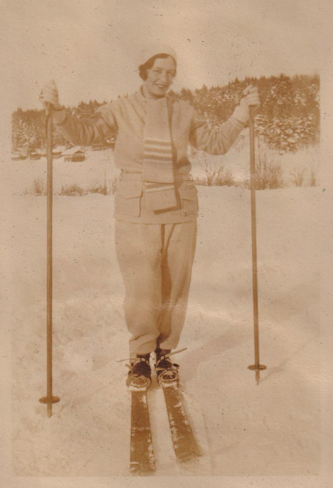 Black-and-White photograph of Amy Jones on skis.