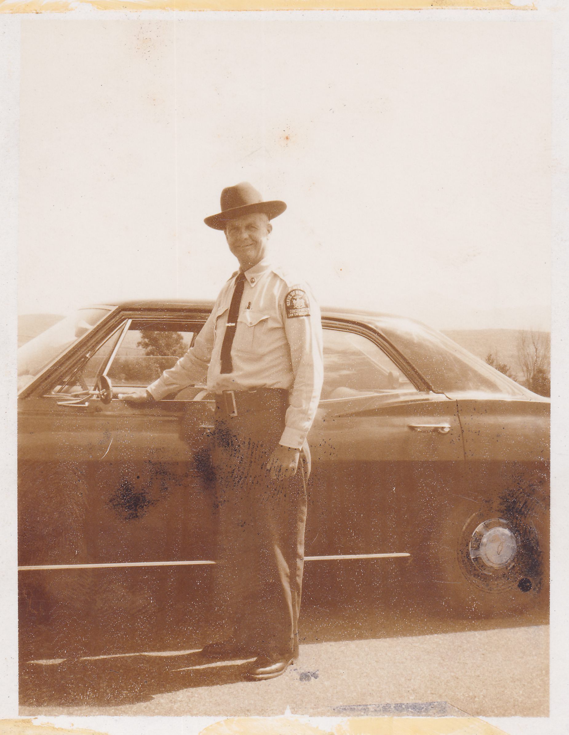 Black-and-White photograph of an unidentified man in a New York state game warden uniform. He is standing next to a car.
