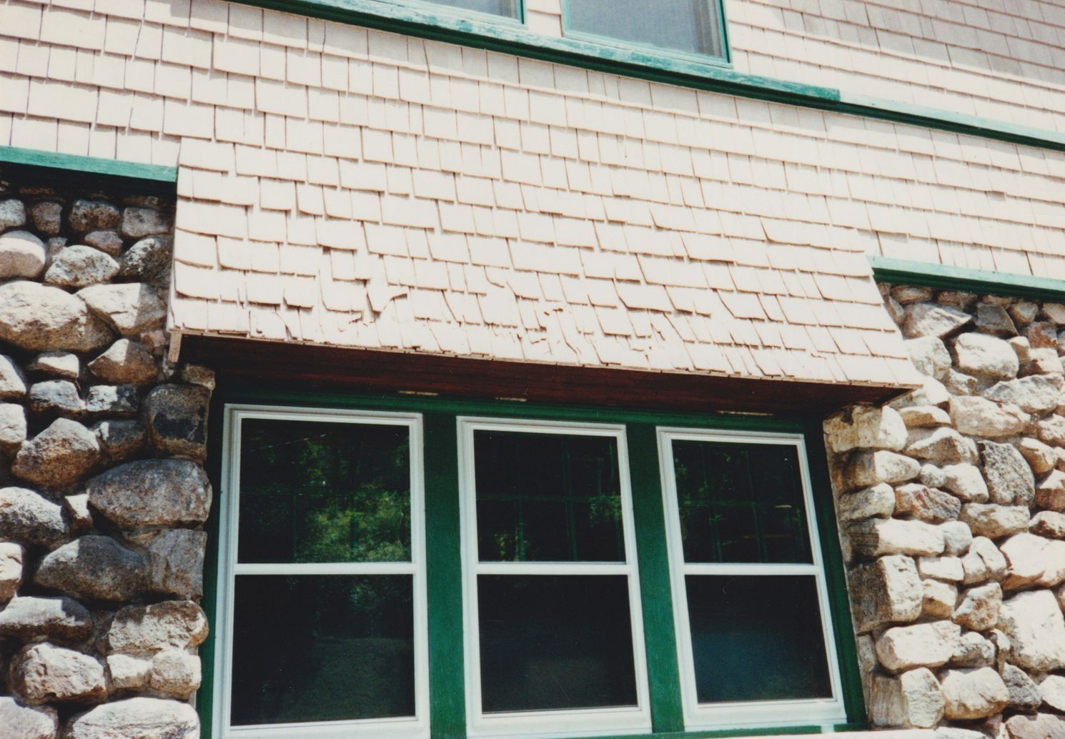Color photograph of three windows inset in a brick wall, part of a building on the American Management Association grounds. This item is not fully cataloged but has been uploaded so the image is publicly available; if you would like us to prioritize cataloging this item, please contact the HSL Collections team.