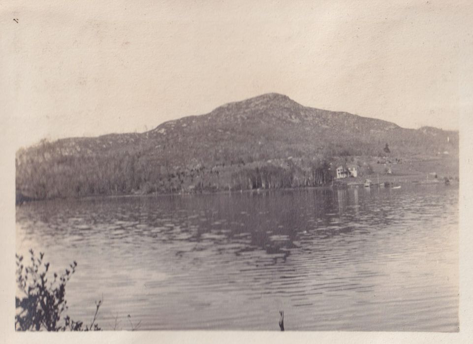 Black-and-white photograph of a lake with a mountain butting one shoreline.