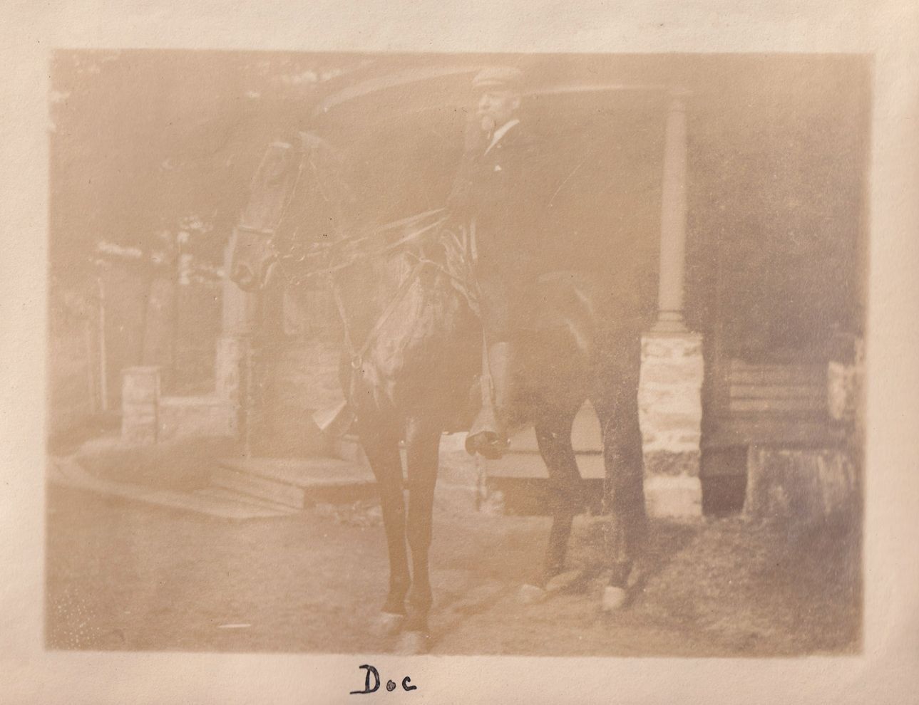 Black-and-white photograph of a man on a horse in front of a house with columns supporting a portico. "Doc" is written in ink beneath the photograph.