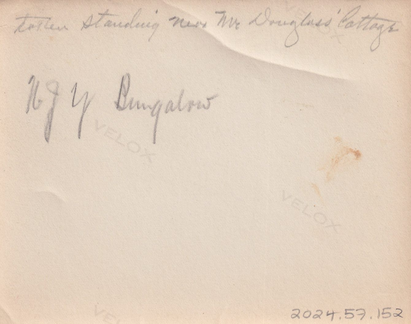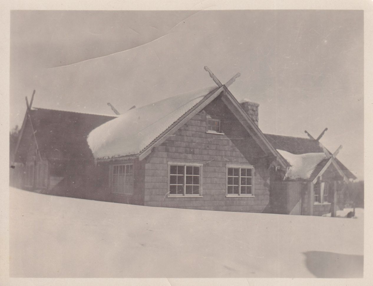 Black-and-White photograph of a cottage at Bartlett Carry Club in the snow. Handwritten note on reverse reads, "NJY [?] Bungalow. Taken standing near Mr. Douglass' Cottage."