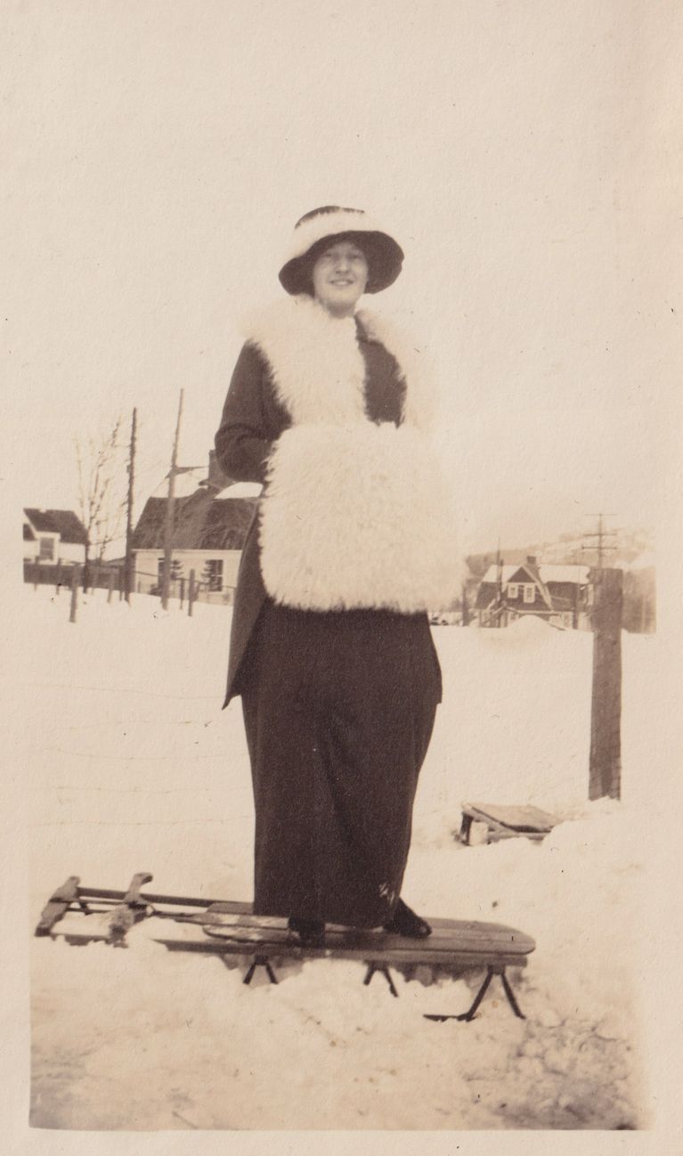 Black-and-white photograph of a woman standing on a wooden toboggan on a snow-covered road. She is wearing a long jacket, fur scarf, fur-lined hat, and holding a fur muff.