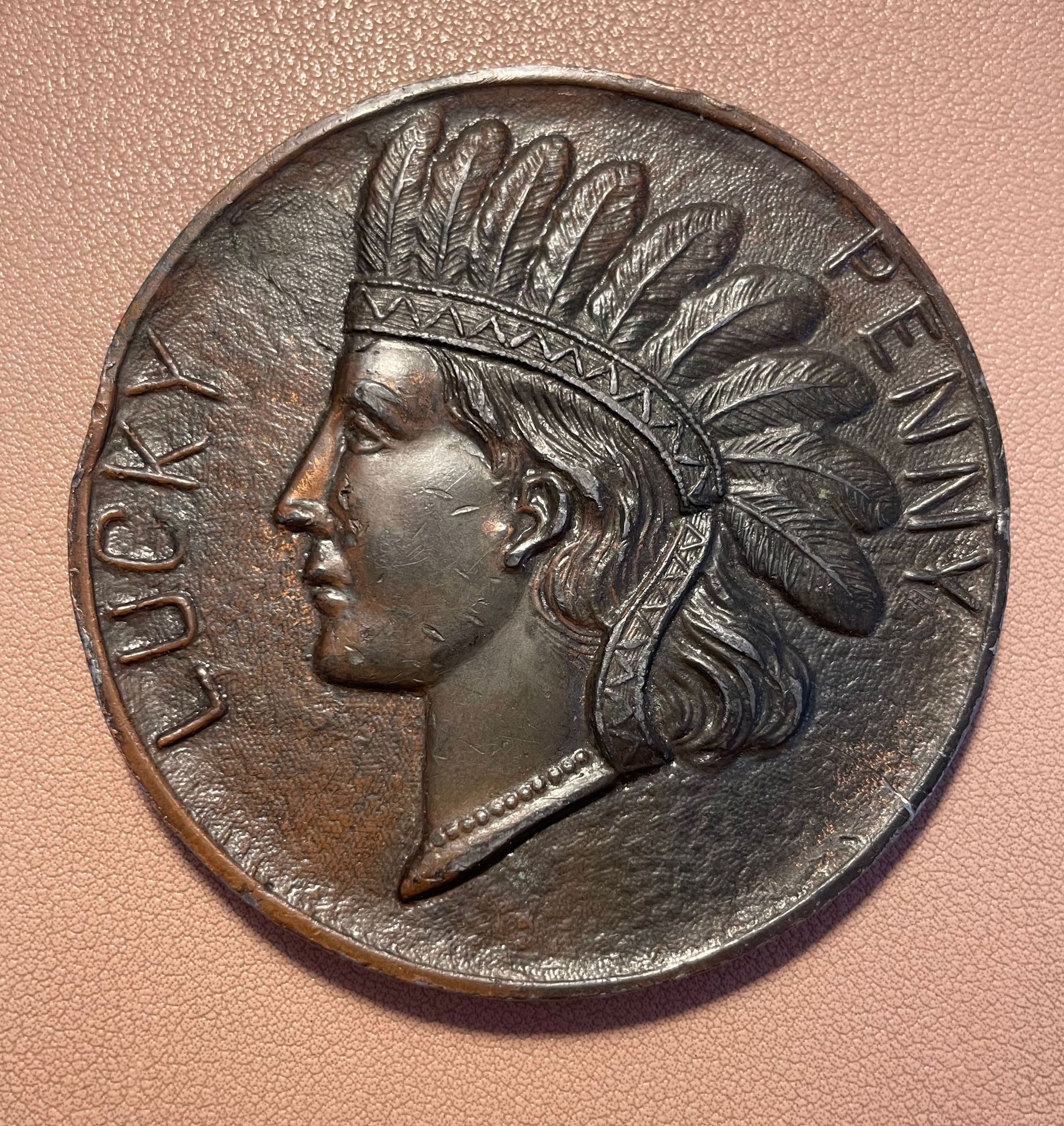 Souvenir coin with relief image of Native American in profile, reading, "Lucky Penny," around edge. Reverse reads, "Souvenir Penny of Saranac Lake, N.Y." with reed motif. No maker's mark.Collection