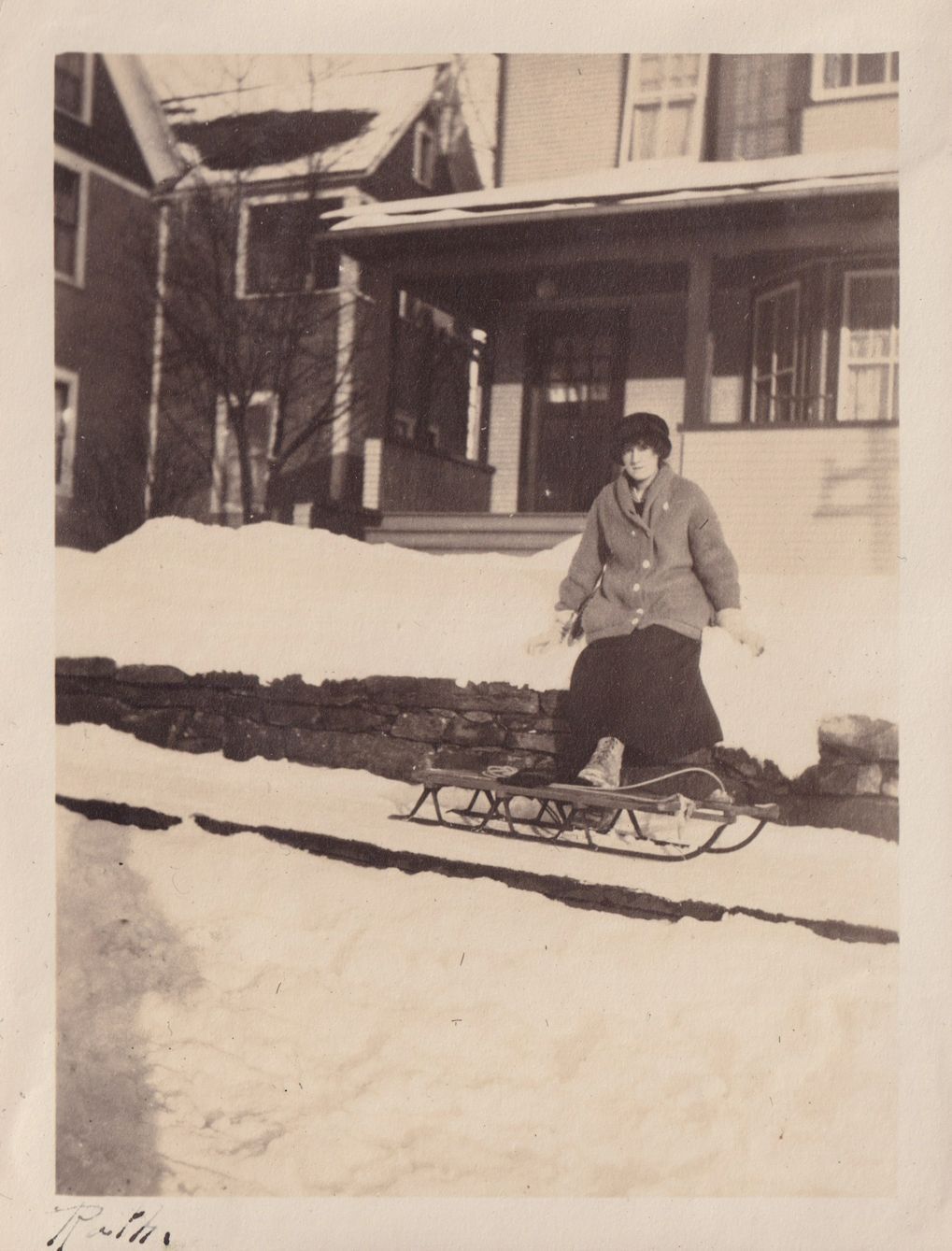 Black-and-white photograph of a woman sitting on a snow-covered stone fence with her foot resting on a toboggan in front of her. "Ruth" is written in ink at the bottom of the photograph.