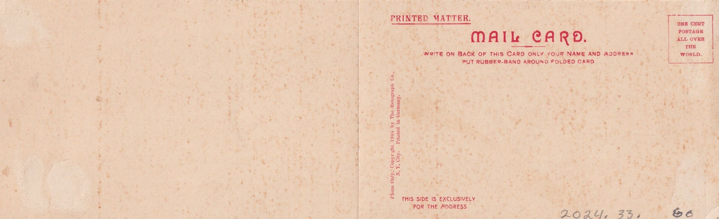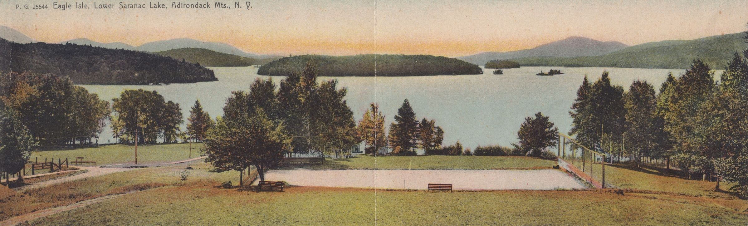 Color panoramic postcard with an image of Eagle Island on Lower Saranac Lake, seen from the Ampersand Hotel. A tennis court is visible in the foreground. Printed caption on front reads, “Eagle Isle, Lower Saranac Lake, Adirondack Mts., N. Y.” Printed by the Rotograph Co., New York City. Unused, divided back.Subject Place