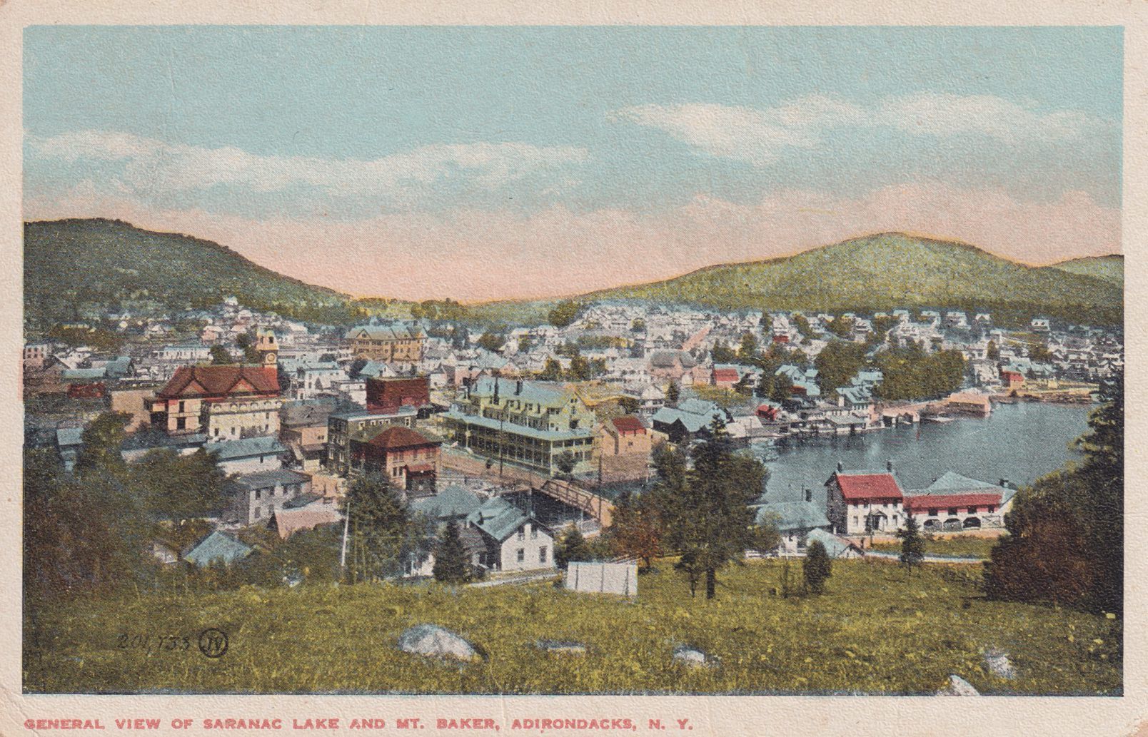Color postcard showing the view of Saranac Lake and Lake Flower from Blood/Lake Street Hill. Printed caption on front reads, "General View of Saranac Lake and Mt. Baker, Adirondacks, N. Y." No printer's mark. Used, divided back, white border, postmarked Raybrook, NY, October 18, 1919. Handwritten message on back reads, "Oct. 8, 1919. Dear Sister Fannie, I will let you no that I got the paper all rite and I feel good now it is very clode. This morning I having here from Jennie yet as there sick or what is the matter. Will [?] from Ray Brooke, N. Y." Mailed to Mrs. Charles Edwards, 45 W. Carthage, Madison St., NY.Subject Place