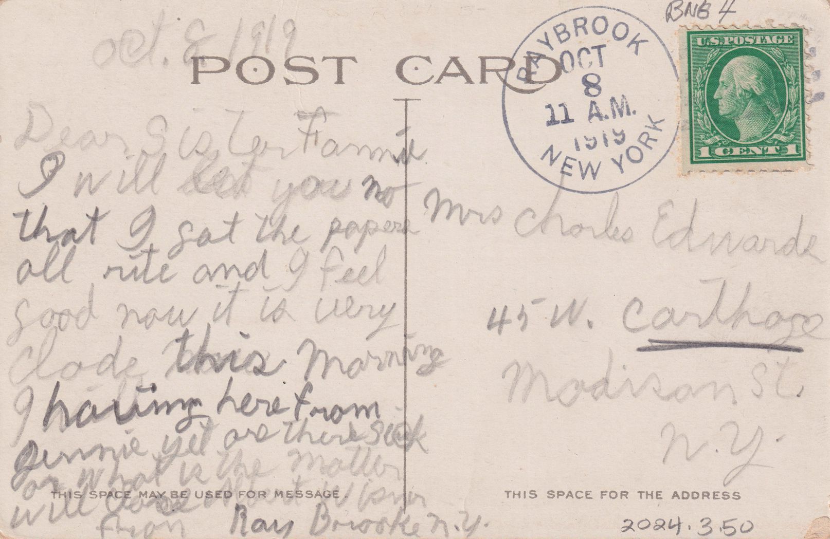 Oct. 8, 1919. Dear Sister Fannie, I will let you no that I got the paper all rite and I feel good now it is very clode. This morning I having here from Jennie yet as there sick or what is the matter. Will [?] from Ray Brooke, N. Y.Transcriber