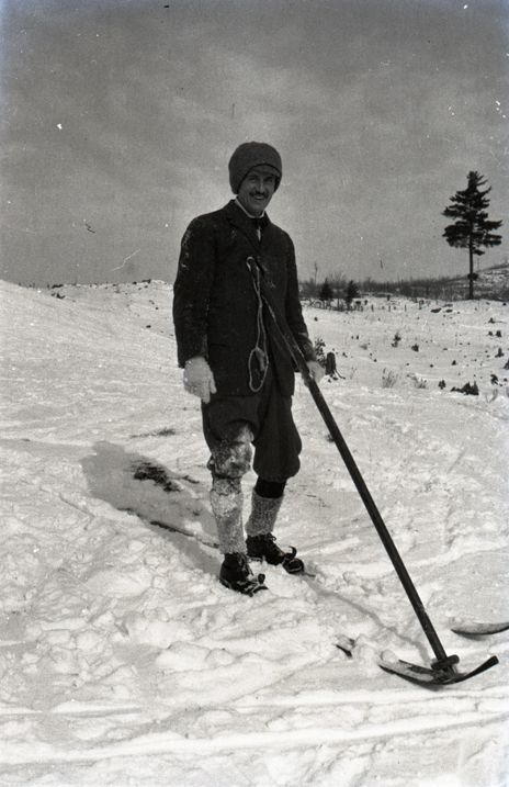 Negative of an unidentified man on skis outside in a snowy field. Most likely taken by Mary Ives Baldwin. This item is not fully cataloged but has been uploaded so the image is publicly available; if you would like us to prioritize cataloging this item, please contact the HSL Collections team.