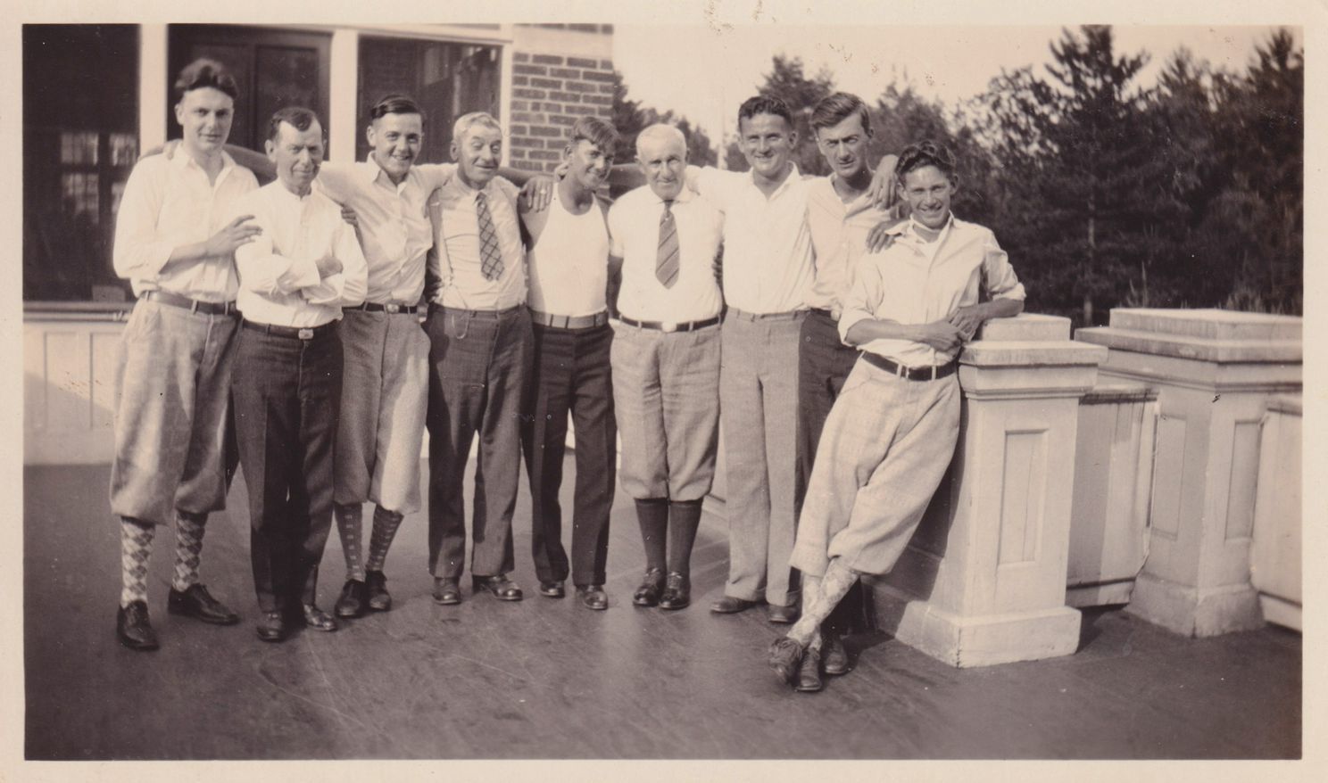 Black-and-White photograph of a group of unidentified men on the veranda of the main building at the New York State Hospital for Incipient Tuberculosis, aka Ray Brook Sanatorium. The photograph was likely printed by Kollecker's Kodak and Gift Shop.