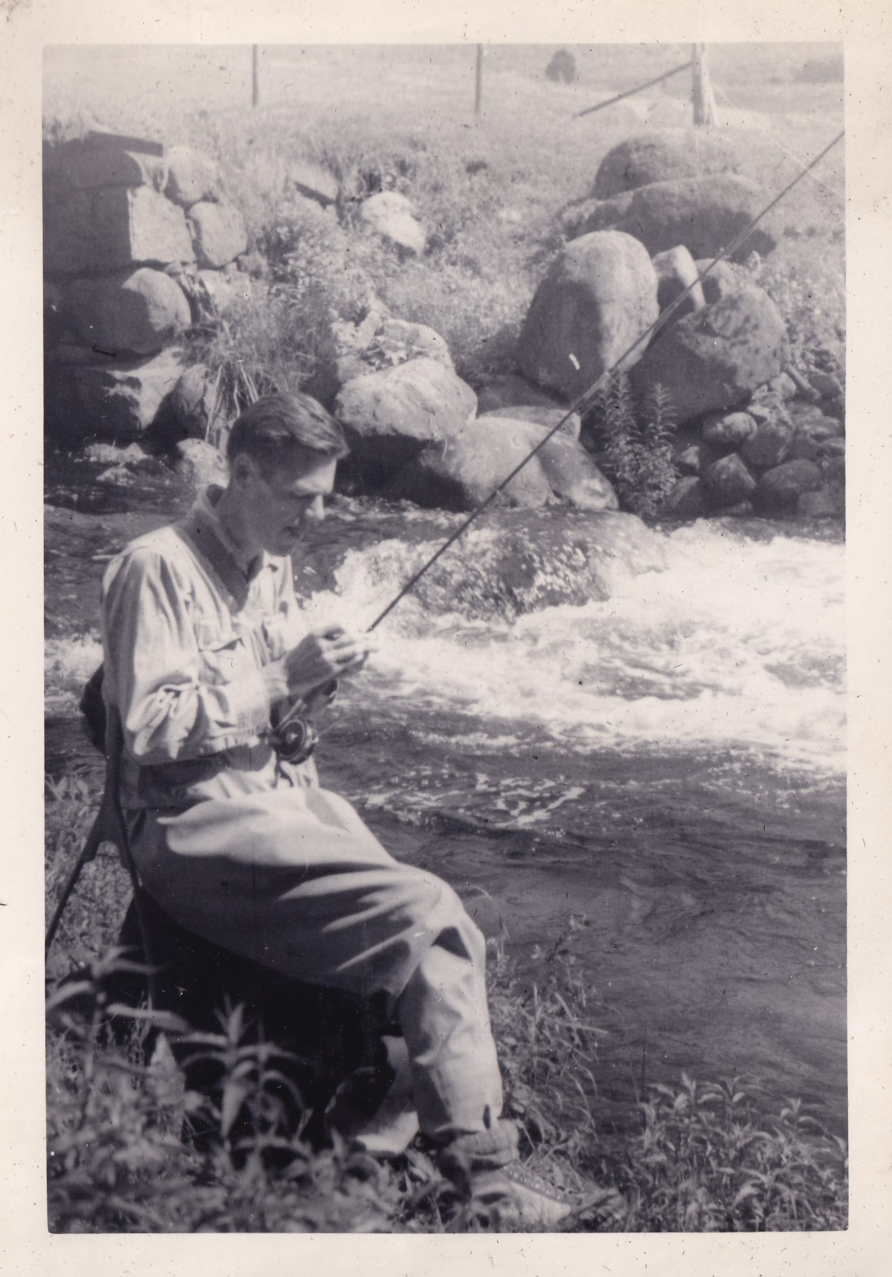 Black-and-White photograph of an unidentified man fishing. He is seated on a small chair or stool, and the river is visible behind him.