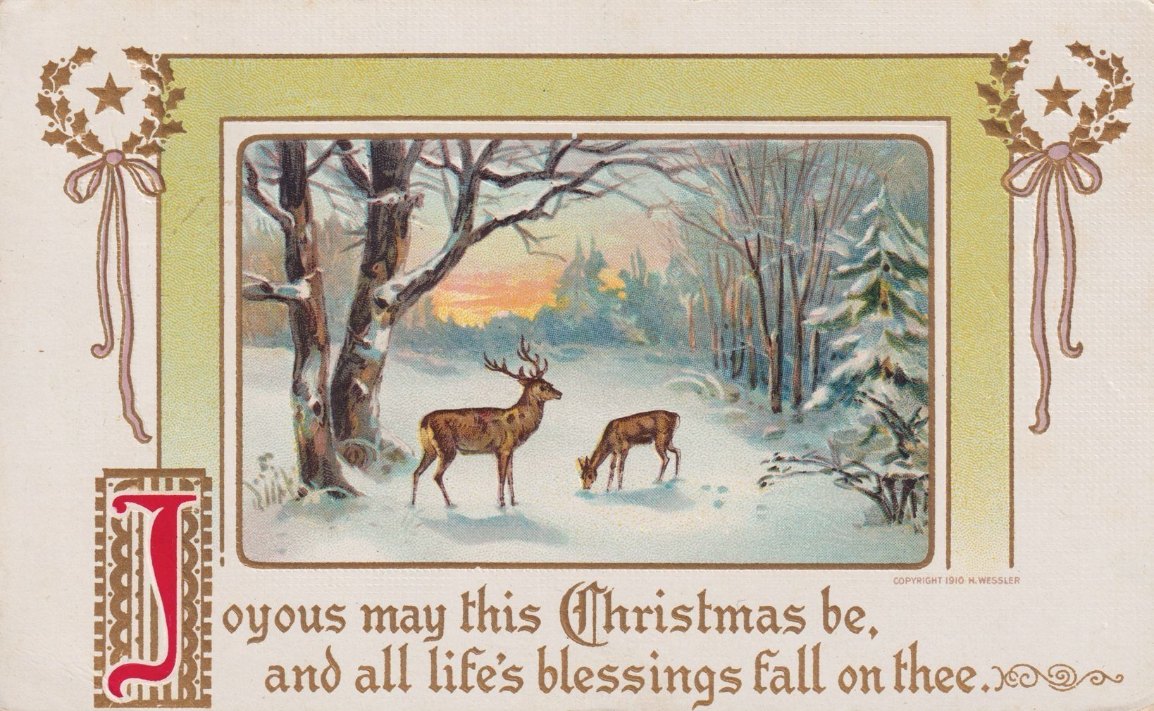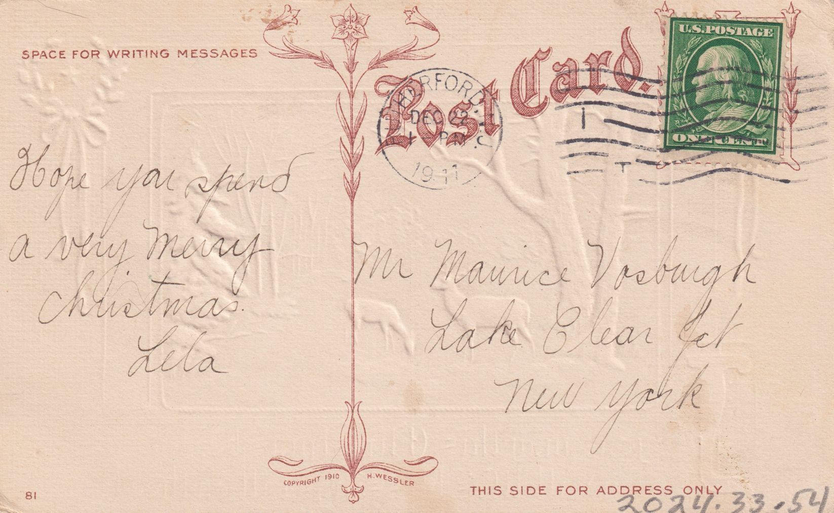 Color postcard with an illustration of two deer in a snowy scene, surrounded by a frame and "Joyous may this Christmas be, and all life's blessings fall on thee." The postcard is addressed to Mr. Maurice Vosburgh of Lake Clear.