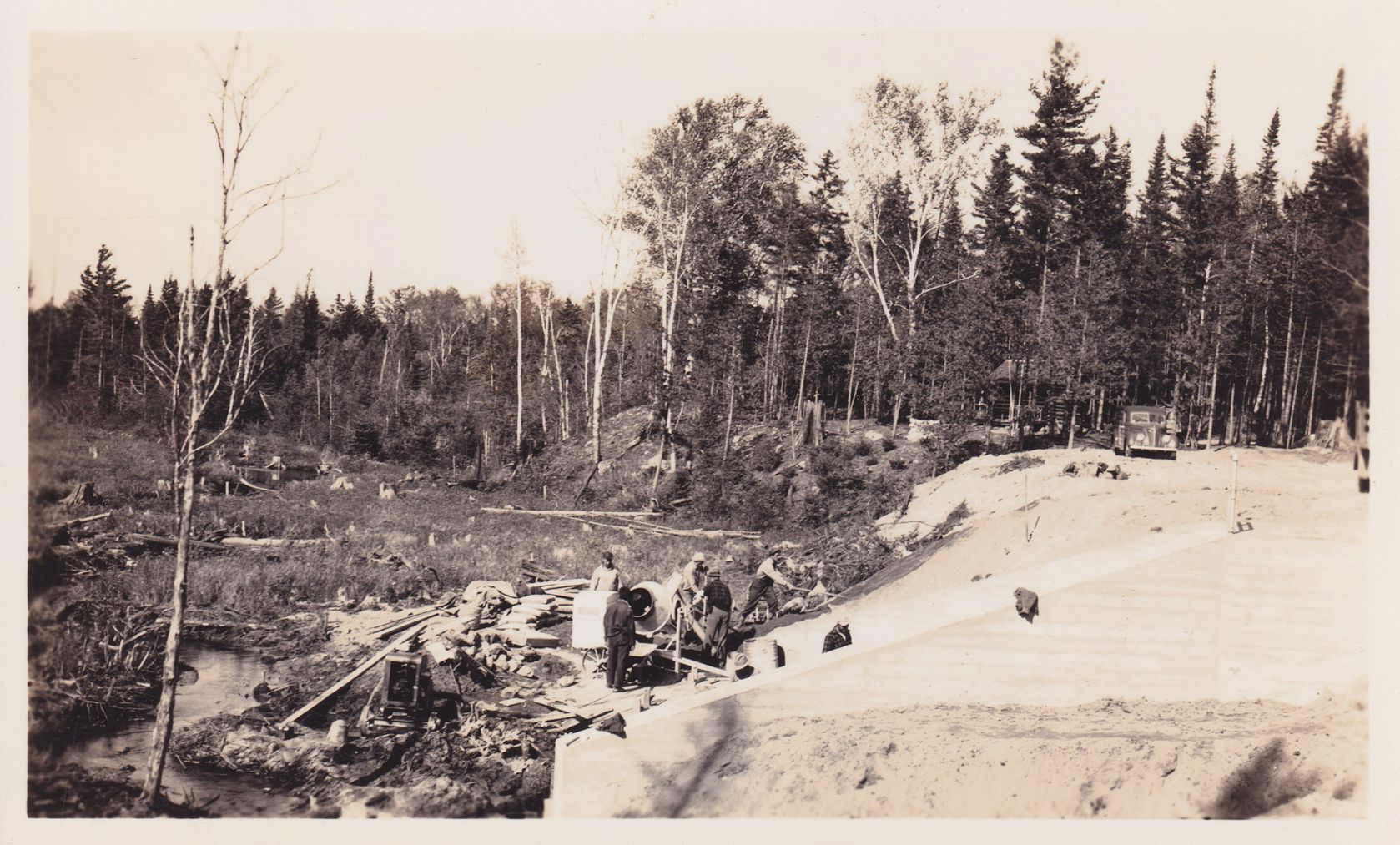 Black-and-White photograph of workers using a cement mixer and other equipment to construct a structure in a wooded area. The photograph was likely printed by Kollecker's Kodak and Gift Shop.